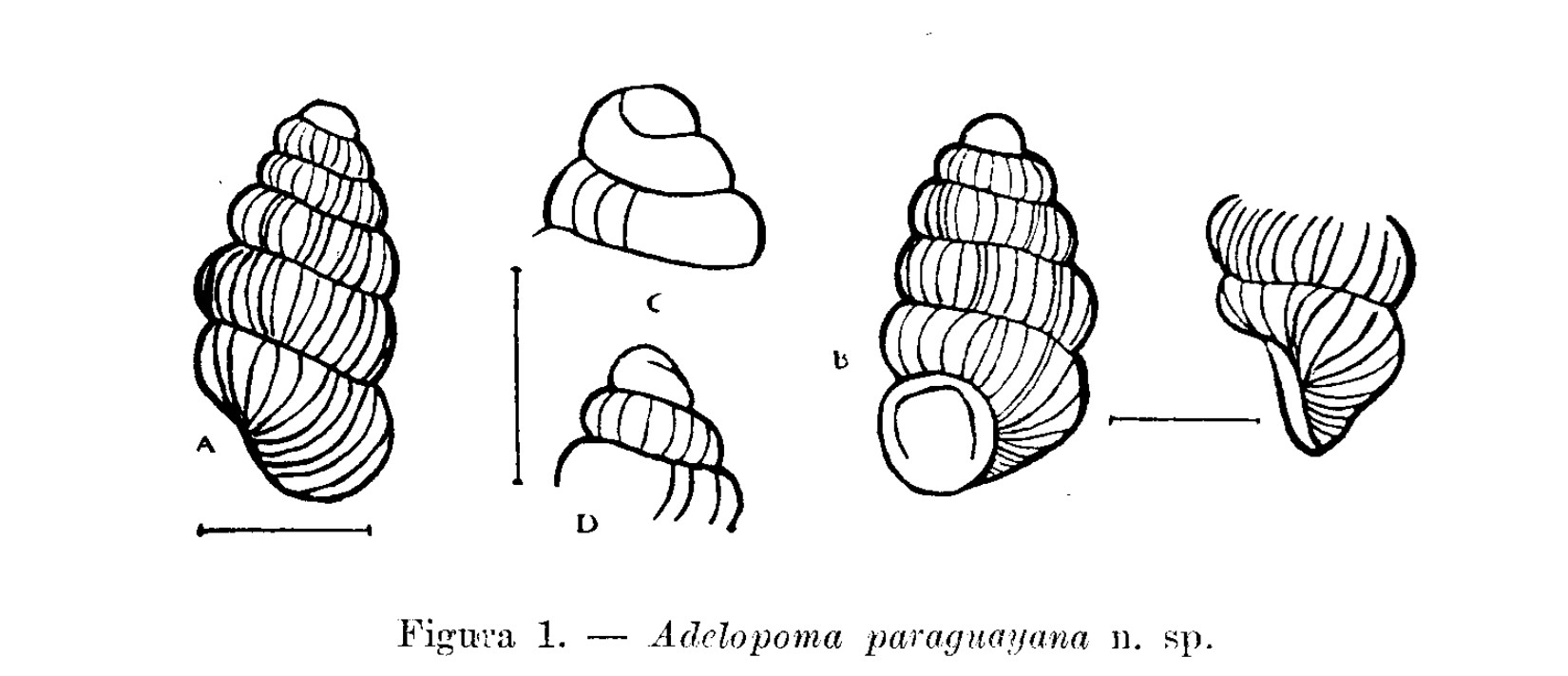 Descrição original: (como Adelopoma paraguayana Parodiz, 1944) Parodiz, J. J. (1944). Contribuciones al conocimiento de los moluscos terrestres sudamericanos, 1. Comunicaciones zoológicas del Museo de Historia Natural de Montevideo. 1(8):1–9.