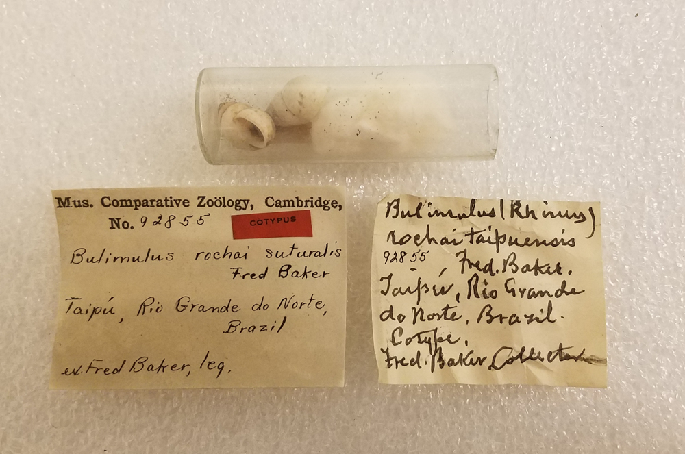 Foto: (1) cortesia Femorale, 2019, Ceará, 30 mm; (2) The Academy of Natural Sciences, Philadelphia: LECTOTYPE de Bulimulus rochai taipuensis Baker, ANSP 109321, “Fossil beds Taipu”, Brazil, coll. Dr Fred Baker, 1913; (3) Museum of Comparative Zoology, Harvard University: COTYPE, MCZ 92855, Taipú, Rio Grande do Norte, coll. Fred Baker