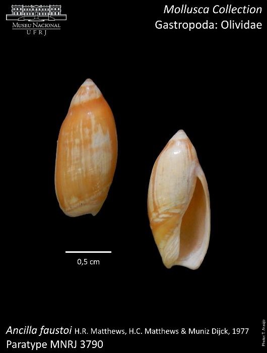 Descrição original: Matthews, H. R., H. C. Matthews and M. P. Muniz Dijck. 1979. Uma nova espécie do género Ancilla Lamarck, 1799, do Nordeste Brasileiro (Mollusca: Gastropoda) Arquivos de Ciências do Mar 17 115-119. [Stated date: — Dec 1977.]