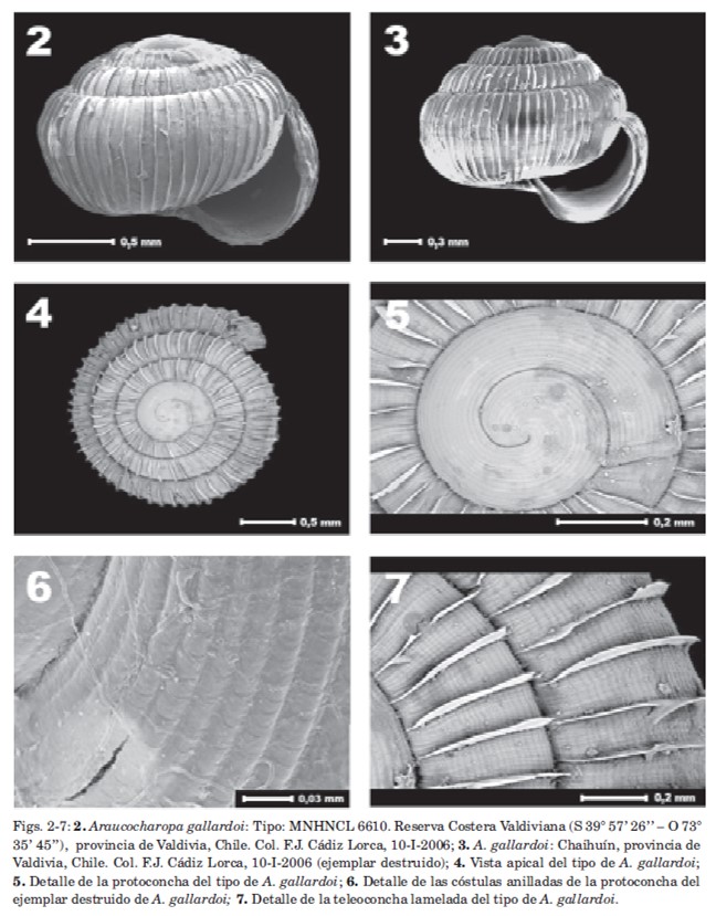 Descrição original:Miquel, S. E.; Cadiz Lorca, F. J. (2008). Araucocharopa gallardoi gen. et sp. n. of Charopidae (Gastropoda: Stylommatophora: Punctoidea) from southern Chile. Revista del Museo Argentino de Ciencias Naturales. 10 (2): página(s) 329-339