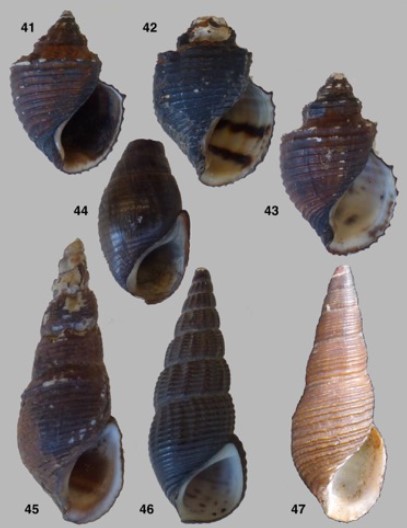 Figura: Breure, Abraham S. H., and Emmanuel Tardy. 2020: (41-43) Aylacostoma crenocarina (S.Moricand, 1841), (41) SYNTYPE de Melanopsis crenocarina melanostoma S. Moricand, 1841, MHNG-INVE-91242 (H = 38.8mm), (42) SYNTYPE de Melanopsis crenocarina bilineata S. Moricand, 1841, MHNG-INVE-91240 (H = 36.2mm), (43) SYNTYPE de Melanopsis crenocarina leucostoma S.Moricand, 1841, MHNG-INVE-91241 (H = 42.9mm); (44) Doryssa ventricosa (J. Moricand, 1856), SYNTYPE MHNG-INVE-91243 (H = 37.6mm); (45) Doryssa brasiliensis (S. Moricand, 1838), SYNTYPE MHNG-INVE-91238 (H = 41.1mm); (46) Doryssa macapa (J. Moricand, 1856), SYNTYPE MHNG-INVE-91239 (H = 37.1mm); (47) Doryssa cingulata (J. Moricand, 1860), SYNTYPE MHNG-INVE-91245 (H = 33.5mm)