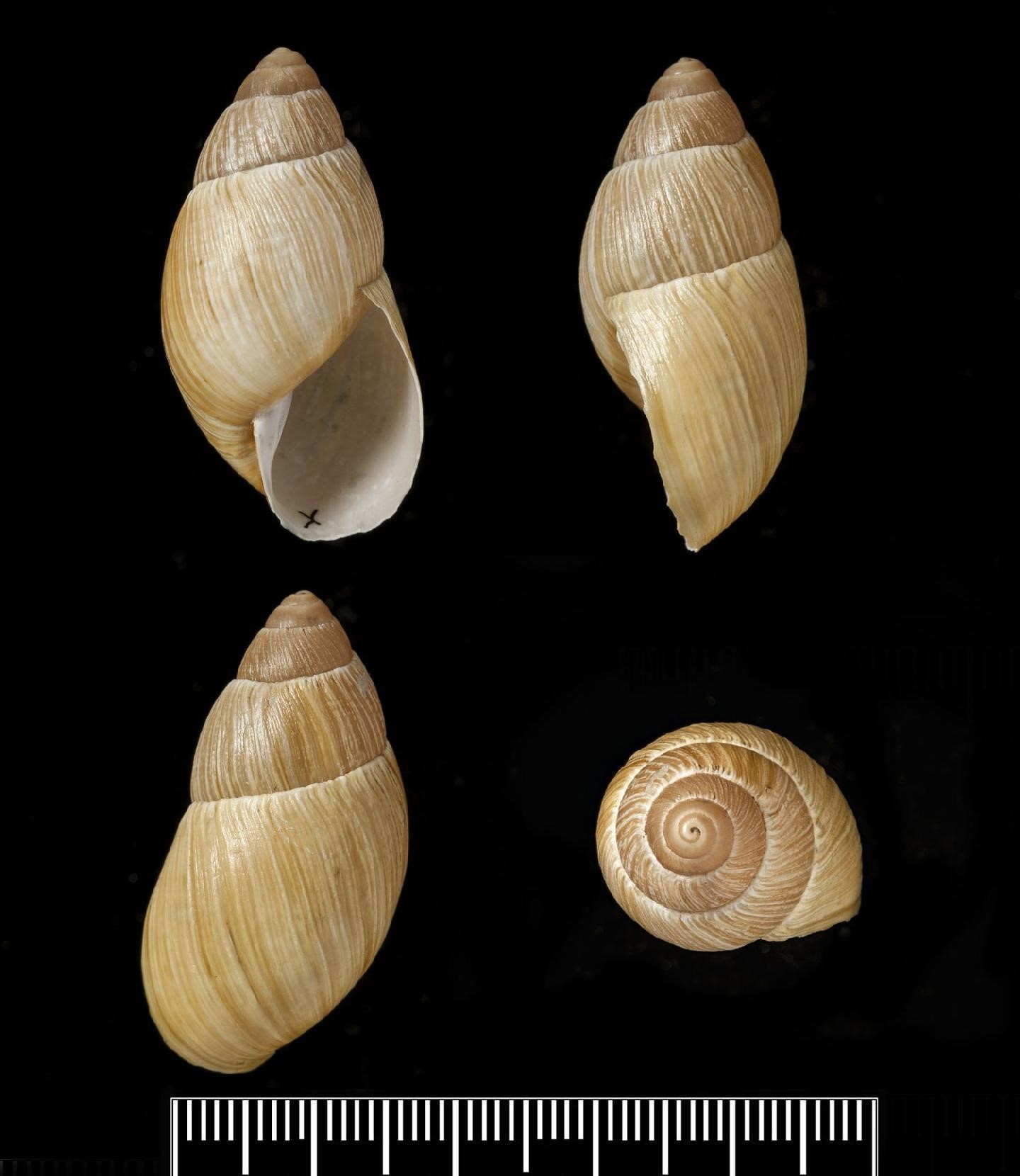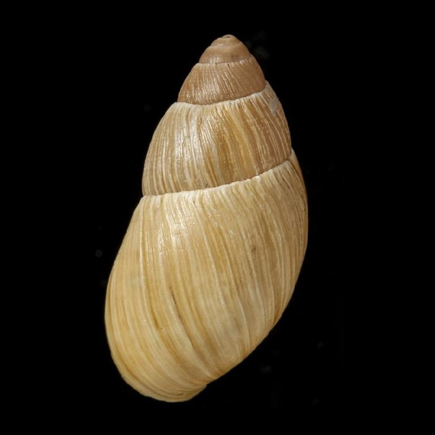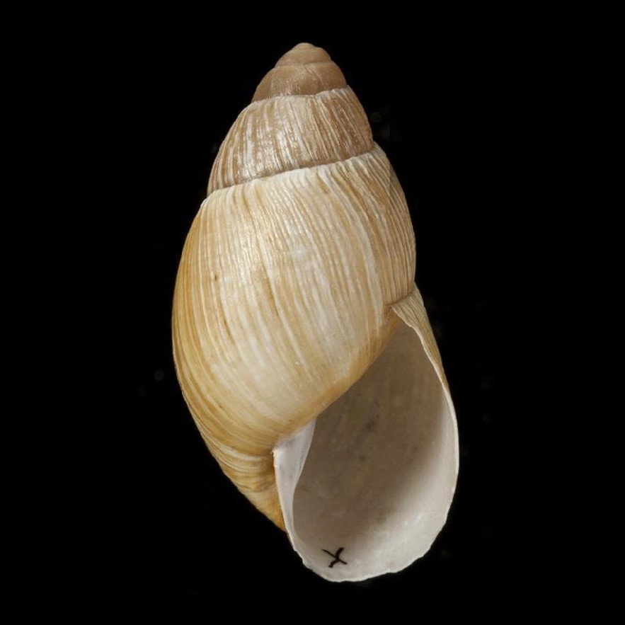 Fotos: (1-3) Natural History Museum, London; LECTOTYPE de Bulimus ochraceus Morelet, 1863, Sorai, Peru, NHMUK 1893.2.4.164-166, 36mm