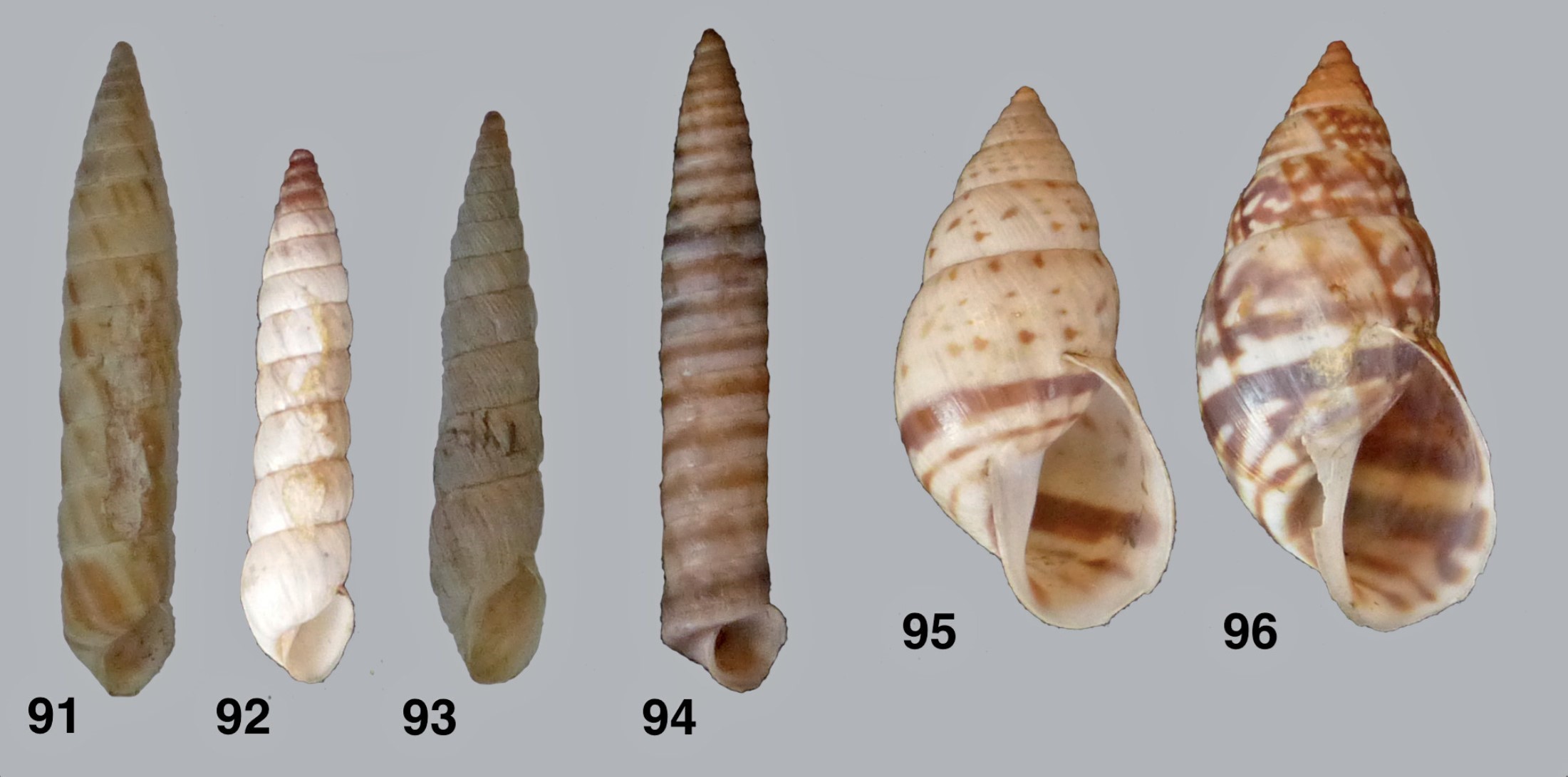 Figura: Breure, 2016: Muséum d’histoire naturelle, Genève: (91) Bostryx cuspidatus (Morelet, 1863), SYNTYPE, MHNG-INVE-60377 (H = 30.2mm); (92) Bostryx acromelas (Morelet, 1863), SYNTYPE, MHNG-INVE-60378 (H = 19.8mm); (93) Bostryx spiculatus spiculatus (Morelet, 1860), PARALECTOTYPE, MHNG-INVE-60411 (H = 23.3mm); (94) Bostryx veruculum (Morelet, 1860), SYNTYPE, MHNG-INVE-60384 (H = 25.2mm); (95-96) Bostryx virgultorum (Morelet, 1863), PARALECTOTYPE e LECTOTYPE respectivamente, MHNG-INVE-60341 (H = 30.5mm)