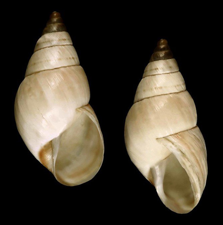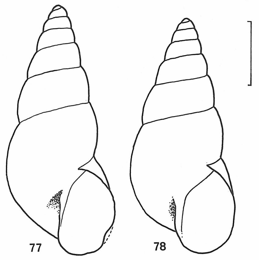 Figura 2: Breure, 1978: Bostryx circuliportus rimacensis, Peru, Departamento de Lima, “Rio Rimac valley, few km E Surco (ca. 75 km ENE Lima), 2100 m”: (77) HOLOTYPE RMNH 55170, 19.5mm; (78) PARATYPE RMNH 55171, 18mm. Linha da escala = 5mm