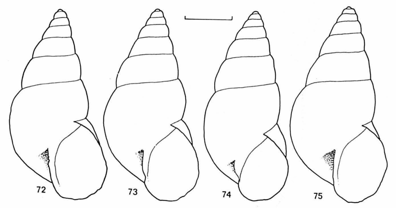 Figura 1: Breure, 1978: Bostryx circuliportus circuliportus,Peru, Lima, 11.5 km SW Canta, HOLOTYPE RMNH 55169 (fig. 72) e PARATYPES (fig. 73-75: RMNH 55183)