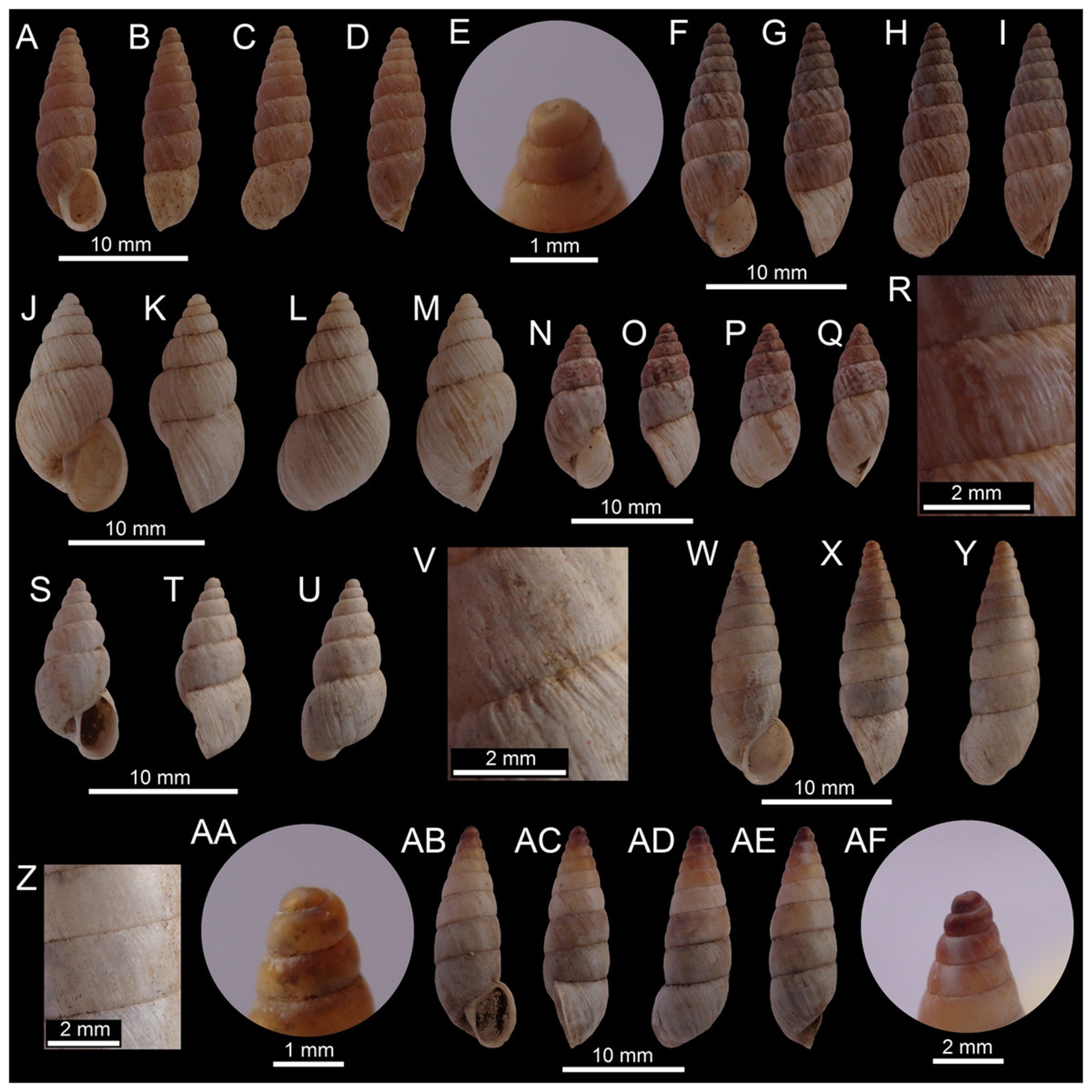 Figura: Arraya 2015: (A-E) Bostryx pupiformis (Pfeiffer, 1857) MZUC 39613 (H: 25.2 mm); (F-I) Bostryx pupiformis (Sowerby I, 1833) MPCCL 13102015C (H: 15.2 mm); (J-M) Bostryx pustulosus (Sowerby I, 1833) RCGCL sem número de lote (H: 15.8 mm); (N-R) Bostryx rhodacme (Rehder, 1945) MZUC 39612 (H: 10.2 mm); (S-V) Bostryx umbilicaris (Rehder, 1945) RCGCL sem número de lote (H: 12.0 mm); (W-Z) Bostryx valdovinosi, HOLOTYPE MPCCL 13102015H (H: 12.0 mm); (AA-AF) Bostryx valdovinosi PARATYPE 1 MZUC 39611 (H: 12.0 mm)