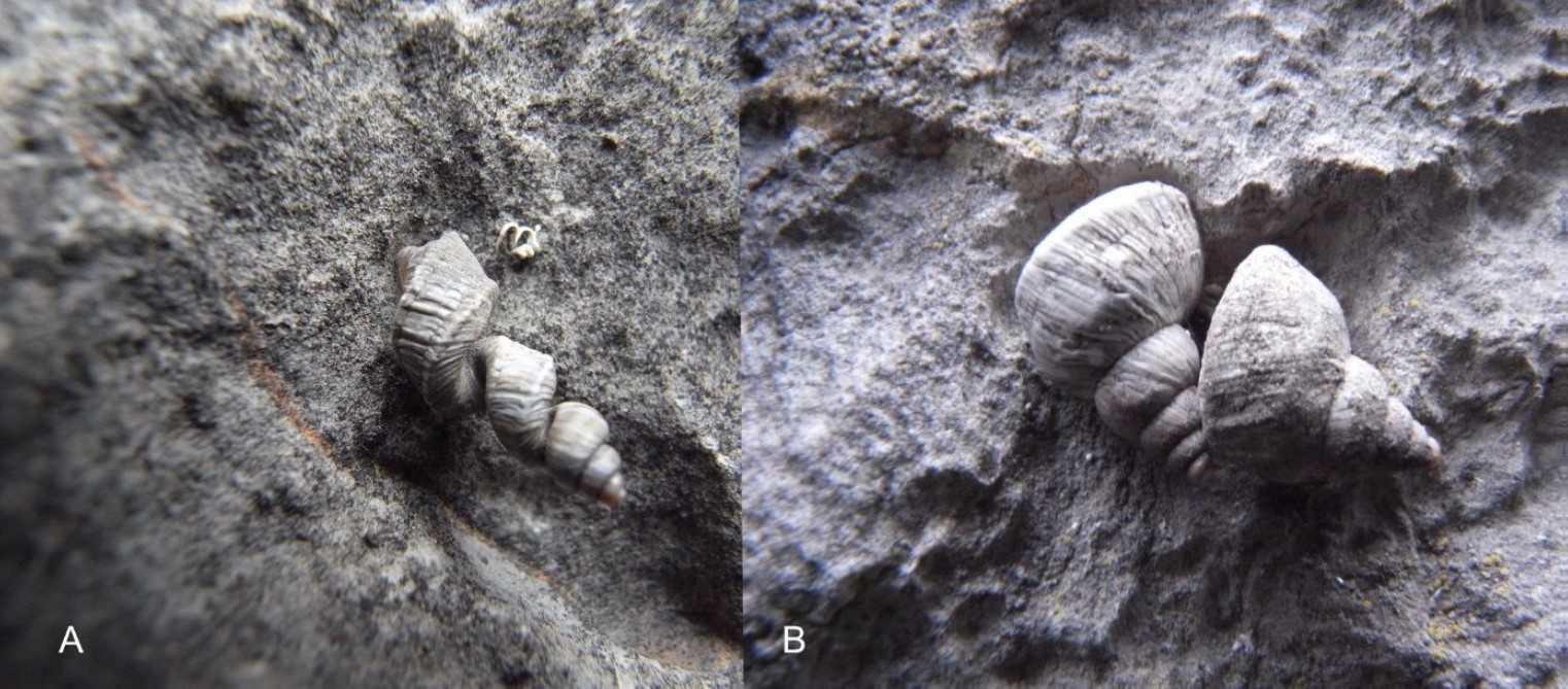 Figura: Breure et al. 2024: different shell shapes in Bostryx solutus in natural habitat. (A) detached shell shape (‘cork screw’); (B) compact shell shape
