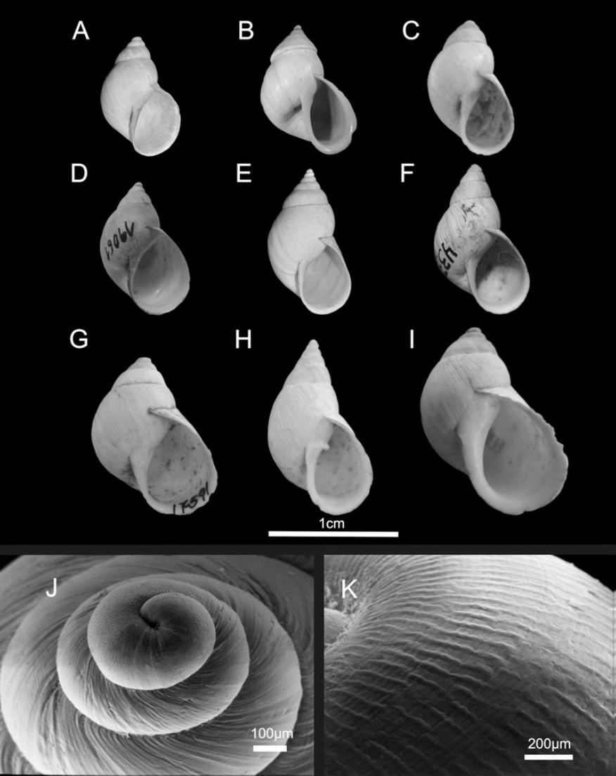 Figura: Miranda, M. J.; Cuezzo, M. G. (2014): variabilidade morfológica de Bostryx stelzneri (Dohrn, 1875): (A) Bostryx stelzneri conispirus (Doering, 1879), (MACN-In 18356); (B) Bostryx stelzneri apertus (Hylton Scott, 1948), HOLOTYPE MLP 11292; (C) Bostryx stelzneri conispirus minuta, MACN-In 6243; (D) Bostryx stelzneri tinogastanus (Parodiz, 1948), HOLOTYPE MACN-In 19061; (E) Bostryx stelzneri hector (Holmberg, 1909), IFML 15587; (F) Bostryx stelzneri hybrida (Parodiz, 1948), HOLOTYPE MACN-In 433; (G) Bostryx stelzneri nonogastanus (Parodiz, 1948), HOLOTYPE MACN-In 17591; (H) Bostryx stelzneri peristomatus paraconispirus (Parodiz, 1948), HOLOTYPE MACNIn 14086; (I) Bostryx stelzneri stelzneri (Dohrn, 1875), MACN-In 17777; (J,K) detalhes da protoconcha