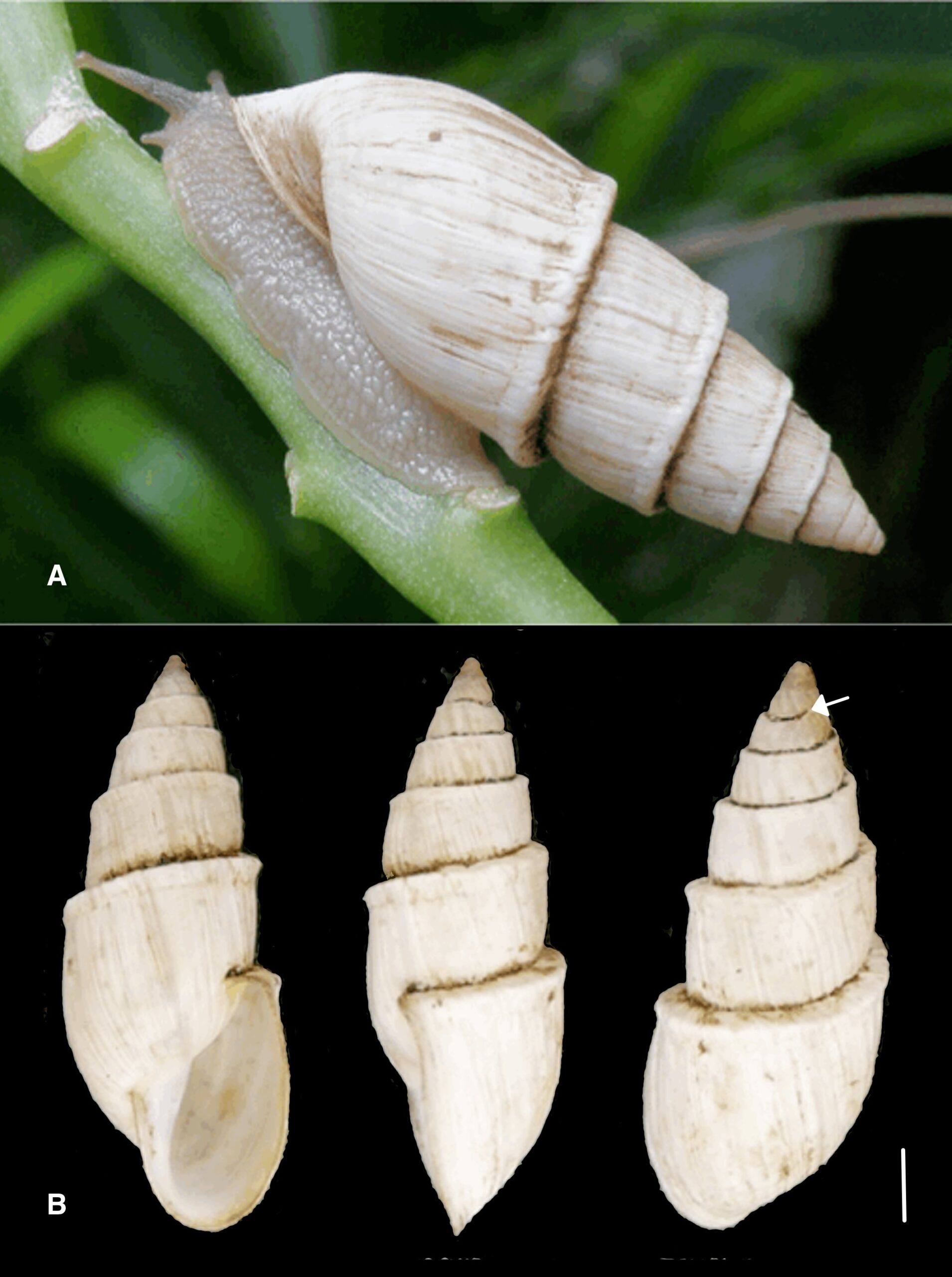 Figura: Breure, 2016: Bulimulus sporadicus (d’Orbigny, 1835), Paraguay, Concepción. U. Drechsel leg., RMNH.MOL.336661 (H=31.3 mm): espécime vivo, crédito da foto: U. Drechsel; (B) diferentes vistas da concha (“arrow indicating the place where the carination starts”). escala = 5mm