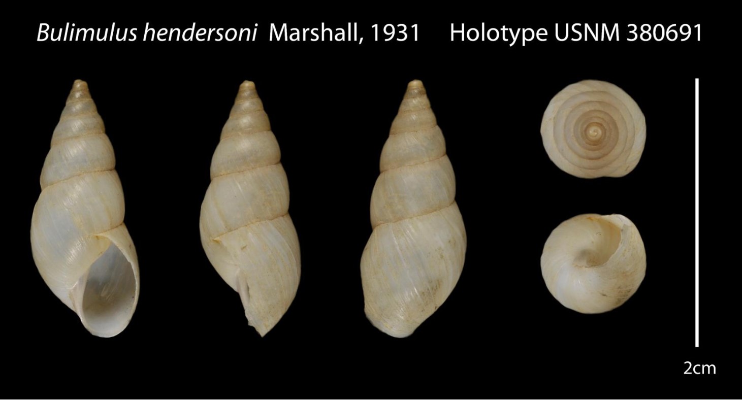 Descrição original: Marshall, W. B. (1931). Bulimulus hendersoni, n. n. The Nautilus. 44(3): 100., disponível online em https://www.biodiversitylibrary.org/page/8514962