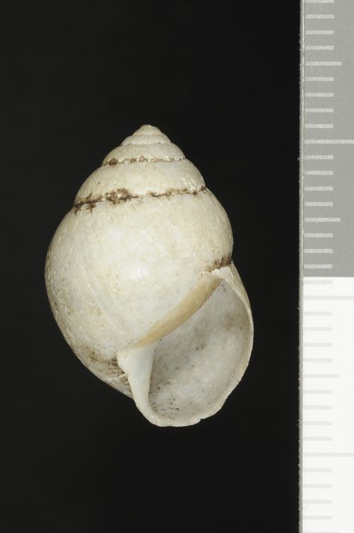 (Pilsbry, 1897): “Shell umbilicate, globose- ovate, rather thin but solid, light yellowish. Surface with inconspicuous growth-wrinkles and extremely fine, close incised spiral strice, visible only above the periphery. Spire very short, conic, the apex obtuse. Whorls slightly over 6,. moderately convex, the suture shallow but well marked. Aperture slightly oblique, ovate, a trifle over half the total length of shell; peristome simple, unexpanded, the columellar margin broadly dilated above.”