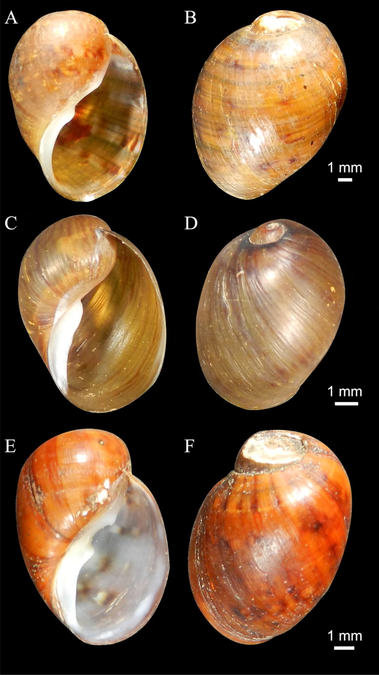 Figura: Gutiérrez Gregoric D.E. & de Lucía M. (2016): HOLOTYPES: (A–B) Chilina nicolasi; (C–D) Chilina santiagoi; (E–F) Chilina luciae