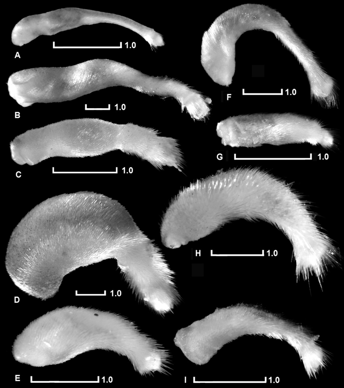 Figura 2: Ivanov & Scheltema, 2008: Holótipos de algumas espécies de Prochaetodermatidae: (A) Chevroderma cuspidatum, Golfo do México; (B) Claviderma amplum, Golfo do México; (C) Spathoderma compactum, Bacia da Argentina; (D) Claviderma crassum, Bacia da Guiana; (E) Spathoderma bulbosum, Golfo do México; (F) Claviderma mexicanum, Golfo do México; (G) Prochaetoderma gilrowei, Golfo do México; (H) Niteomica captainkiddae, Golfo do México; (I) Spathoderma quadratum, Golfo do México