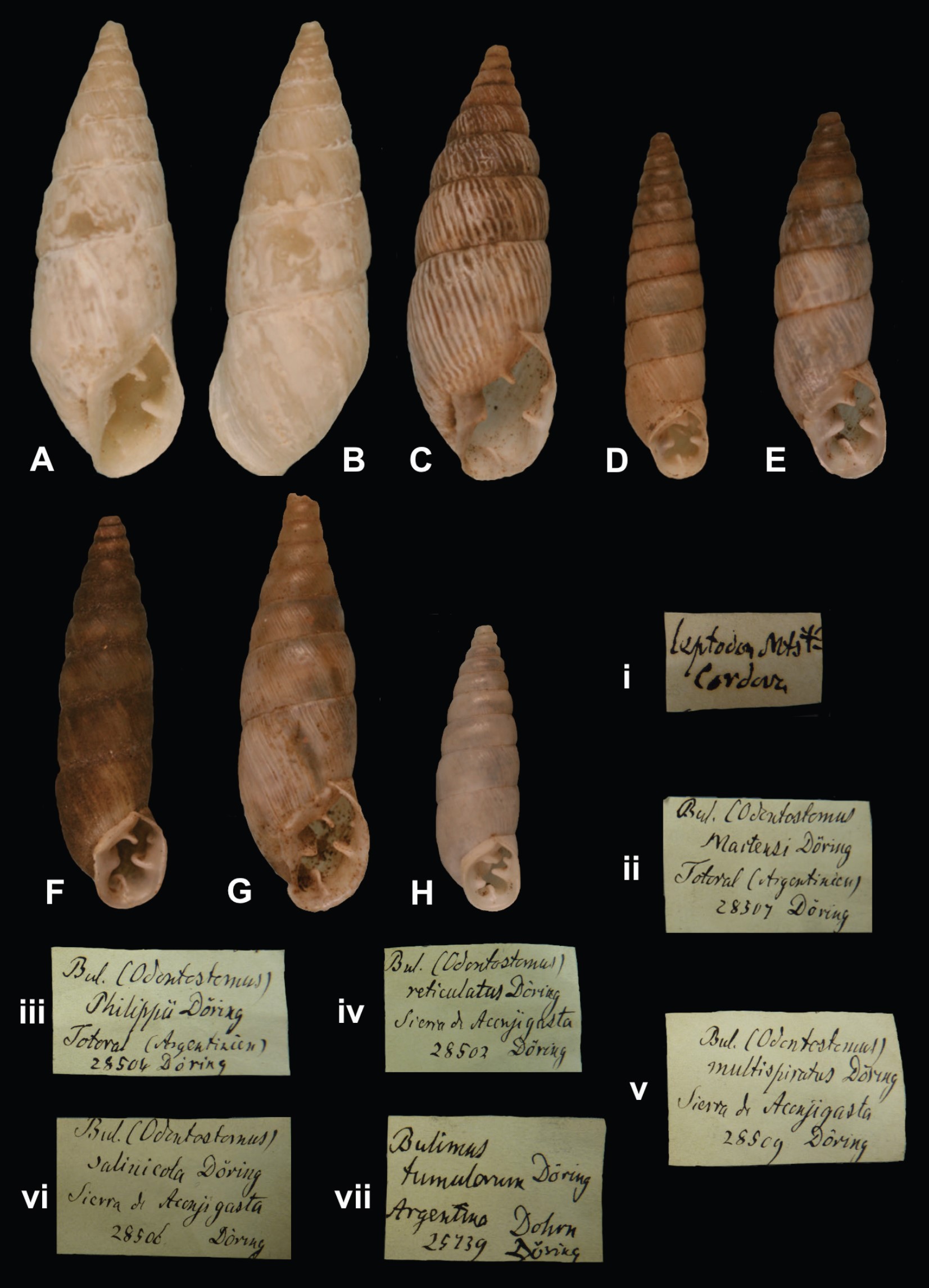 Figura: Breure, Bram. (2013): (A–B, i) Clessinia alvarezii (d’Orbigny, 1837), SYNTYPE de Bulimus (Odontostomus) leptodon Martens, 1875 ZMB 24077 (H = 22.2mm); (C, ii) Clessinia martensii (Doering, 1875), PARALECTOTYPE ZMB 28807 (H = 21.4mm); (D, v) Clessinia multispirata (Doering, 1877), PARALECTOTYPE ZMB 28509 (H = 17.4mm); (E, iii) Clessinia philippii (Doering, 1875), SYNTYPE ZMB 28504 (H = 18.0mm); (F, iv) Clessinia reticulata (Doering, 1877), PARALECTOTYPE ZMB 28502 (H = 18.8mm); (G, vi) Clessinia salinicola (Doering, 1877), PARALECTOTYPE ZMB 28506 (H = 20.4mm); (H, vii) Clessinia tumulorum (Doering, 1875), PARALECTOTYPE ZMB 25739 (H = 13.6mm)