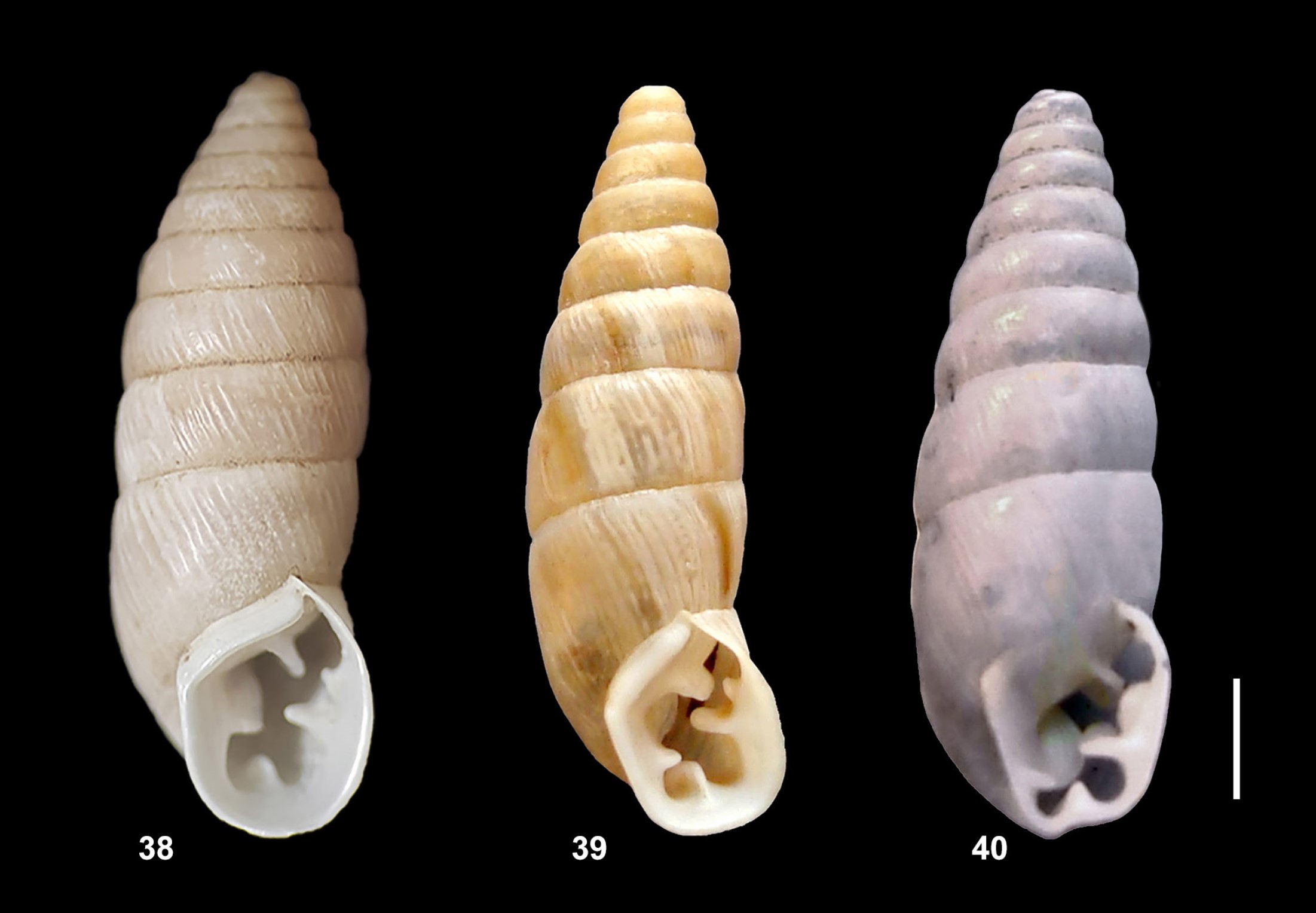 Figura: Oroño & Breure, 2022: comparação as espécies relacionadas: (38) Clessinia subcylindrica; (39) Clessinia tumulorum; (40) Clessinia olainensis. Escala da barra = 5 mm