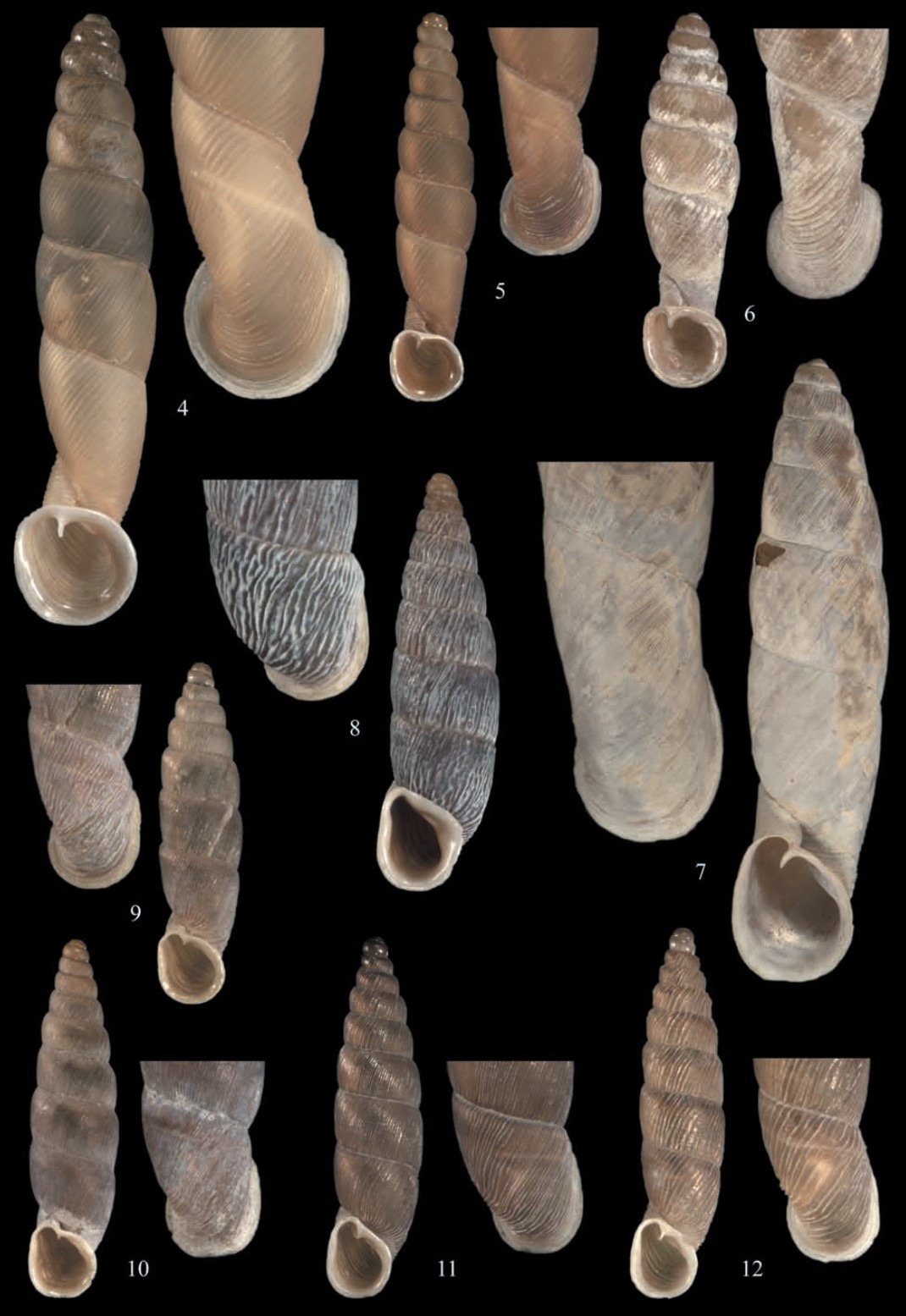 (Nordsieck, 2010): “Shell with thick and obtuse conical apical part; greyish yellowish- to yellowish reddishbrown, protoconch greyish-brown; teleoconch whorls distinctly obliquely ribbed, on the neck more coarsely, ribs in part white; neck rounded, basal keel scarcely recognizable, with dorsal elevation and depression beside, subsutural swelling weak; aperture protruding, roundishoval, light yellowish reddish-brown within, peristome expanded; superior lamella high, continuous with spiral lamella without a curve, spiral lamella nearly equally lower palatal plica weakly developed, connected with or separated from lunella; clausilium plate in oblique view fully visible, distally somewhat pointed, leaving nearly no gaps”