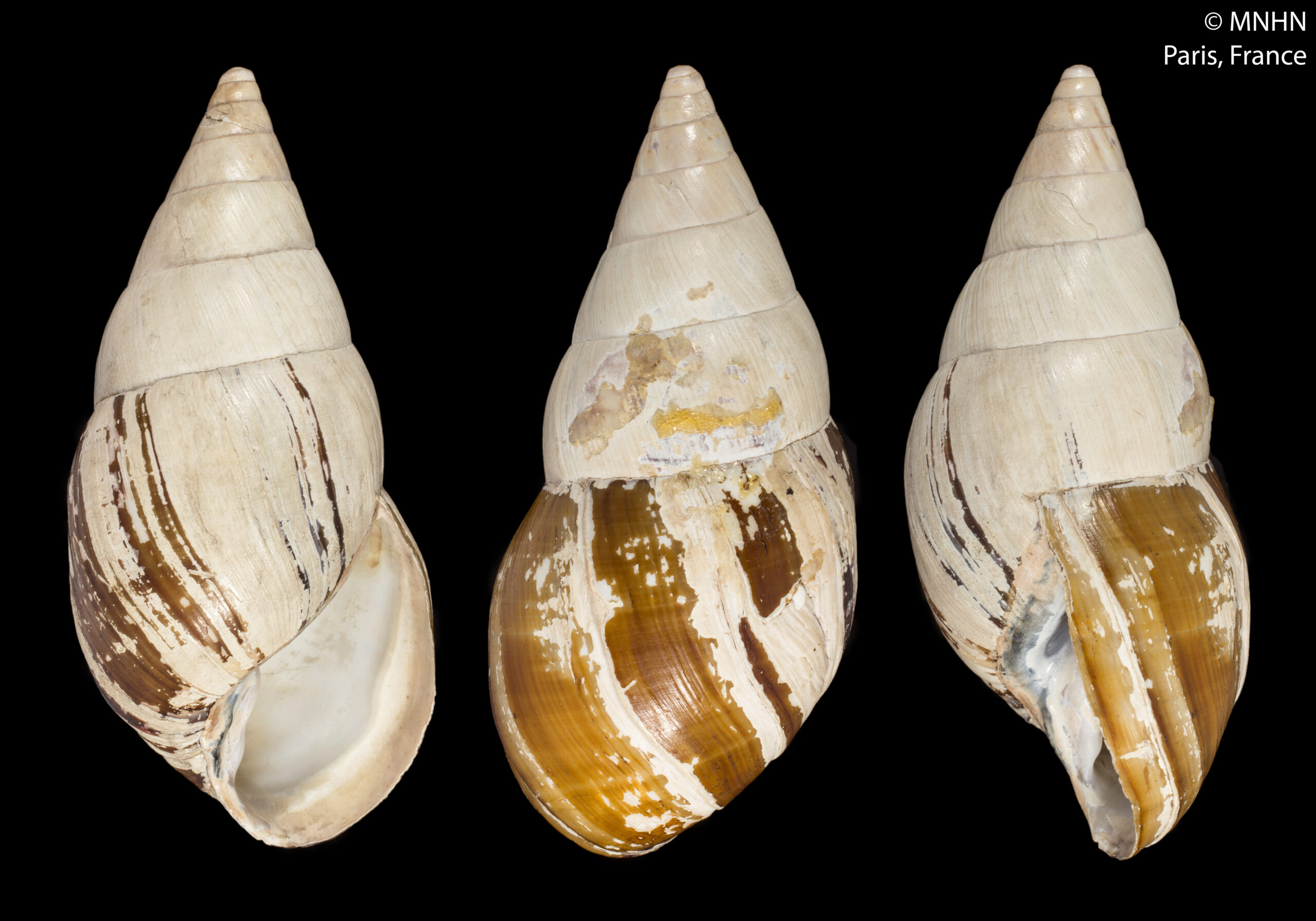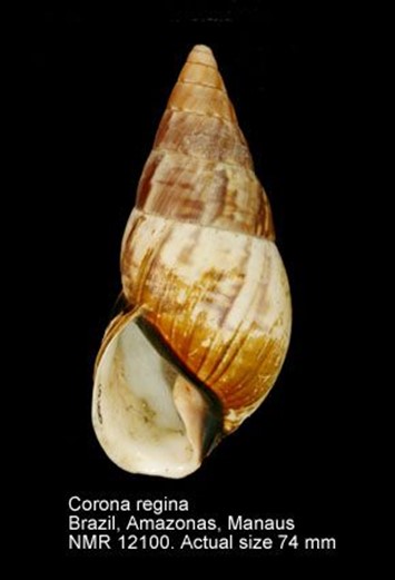 Fotos: (1,2) Museu Nacional de História Natural, Paris. LECTOTYPE de Helix regina Bowdich, 1822; MNHN-IM-2000-21881; Coll. Férussac, 78,6 mm; (3) Natural History Museum Rotterdam, NMR 12100, ex coll. G. van Roon, Manaus, Amazonas, Brasil, 74mm