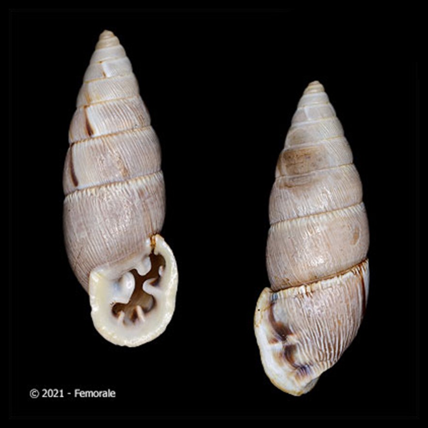 (Dall, 1909): “Shell slender, elongate, subacute, with nine and a half whorls separated by a narrow, deep, but not channeled suture; nucleus small, minutely punctate, with an apical dimple; the subsequent sculpture of fine, even, closeset retractive wrinkles, or riblets, extending from suture to suture and over the base; color white, with irregularly disposed brown lines, usually distant and in harmony with the sculpture; whorls very slightly rounded, the last finally attenuated and externally impressed over the internal denticles; under the reflected lip and behind the large lamina on the pillar is a minute umbilical chink.