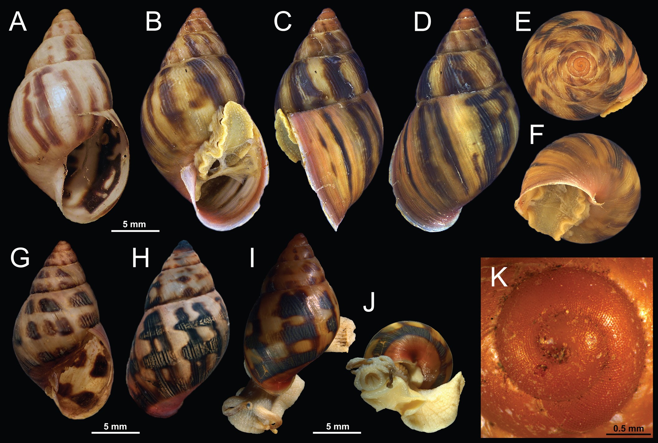 Figura: Rosa et al. 2025: coleção de Drymaeus magus demonstrando a morfologia da concha: (A) LECTOTYPE ZSM 20020093; (B–F) Coleção Malacológica de Ribeirão Preto, Faculdade de Filosofia, Ciências e Letras de Ribeirão Preto, Universidade de São Paulo, CMRP 1118; (G) Museu de Zoologia de São Paulo, MZSP 164980; (H) MZSP 166927; (I, J) CMRP 1059; (K) CMRP 1118, detalhe da protoconcha