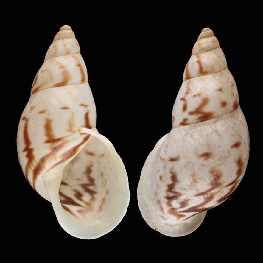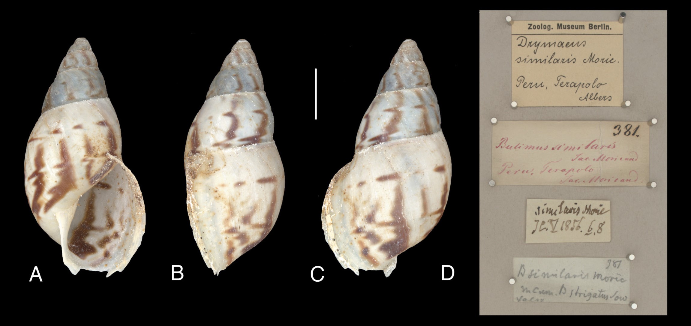 Fotos: (1) Breure et al. 2024, Musée d’Histoire Naturelle, Geneva: SYNTYPE de Drymaeus similaris, MHNG-MOLL 63531; (2) Breure & Ablett, 2024: Museum für Naturkunde Berlin, SYNTYPE ZMB/Moll 264729, “Peru, Terapolo”, ex Albers ex J. Moricand, 23mm