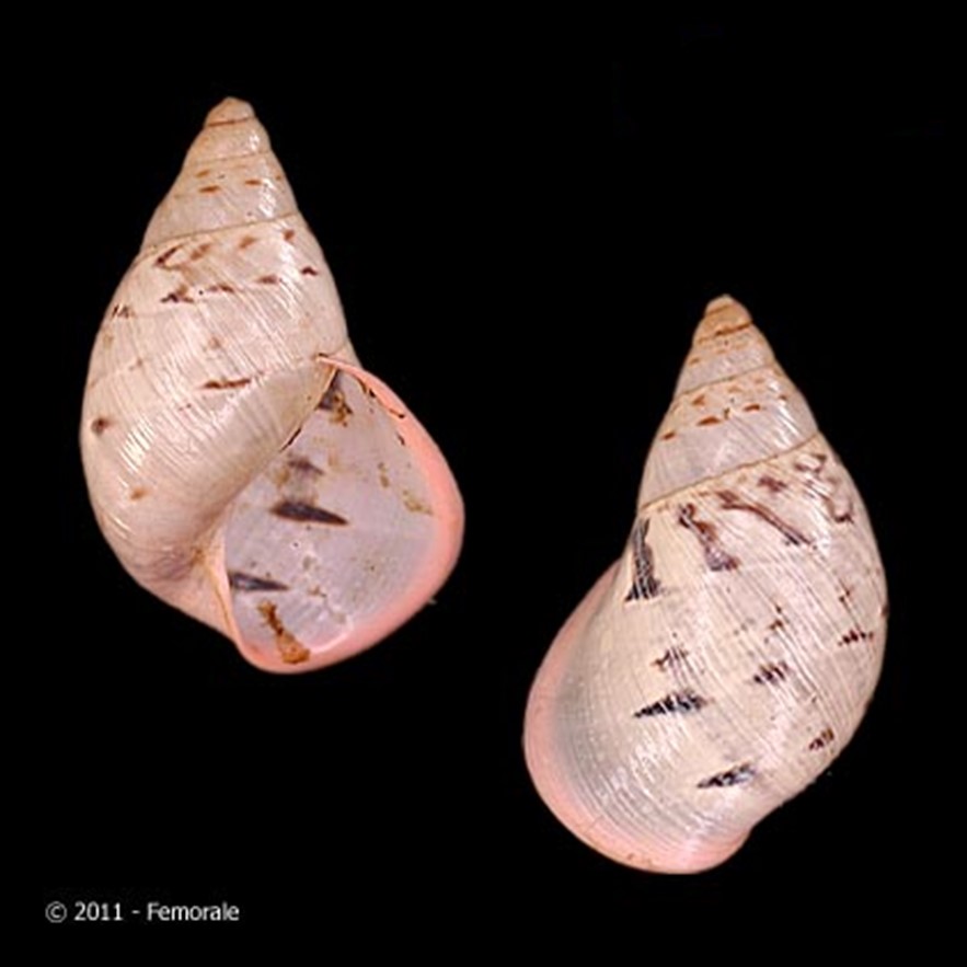 (Restrepo & Breure (1987): “shell up to 24.7 mm, ca. 1.6 times as long as wide, elongate-ovate, imperforate, rather thin with fine axial striae. Protoconch with a reticulate sculpture of axial riblets and spiral striae which are of equal strength. Whorls ca. 5.5, slightly convex, the last whorl inflated; suture impressed. Aperture subovate, ca. 1.6 times as long as wide, ca. 0.7 times the total length. Columellar margin thin and simple. Peristome thin and expanded, pink. Parietal wall with a whitish callus. General colour creamy whitish, with brown spiral streaks, which in most specimens are interrupted, forming arrow-head spots directed towards the peristome.”