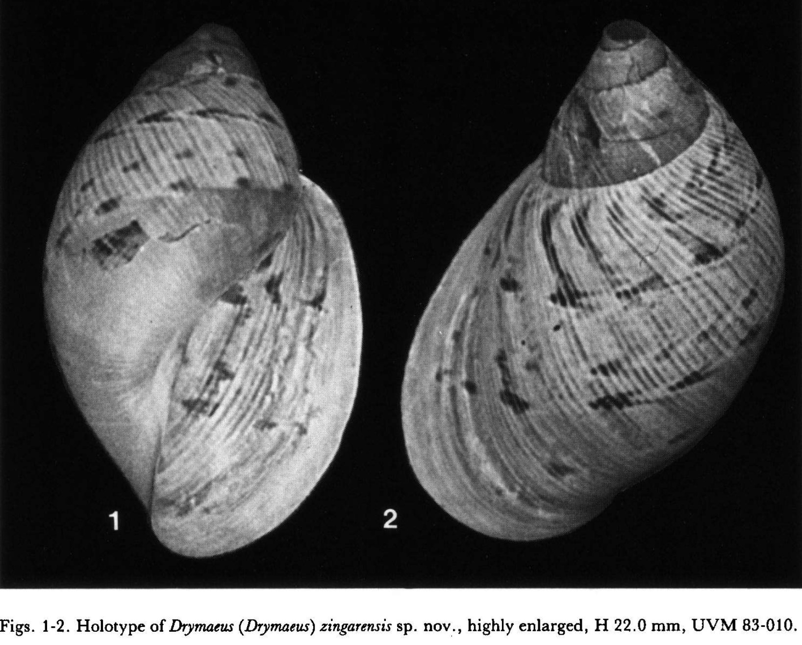 Figura: Restrepo & Breure, 1987: Collection de Malacologla, Seccion de Biologia Marina, Universidad del Valle, Cali (UVM), HOLOTYPE UVM 83-010, “Departamento del Valle, Finca Zingara, km 6on the trail km 18 road Cali-Buenaventura-La Paz, 2000 m de altitude, leg. Manuel Giraldo, February 1983, 22mm