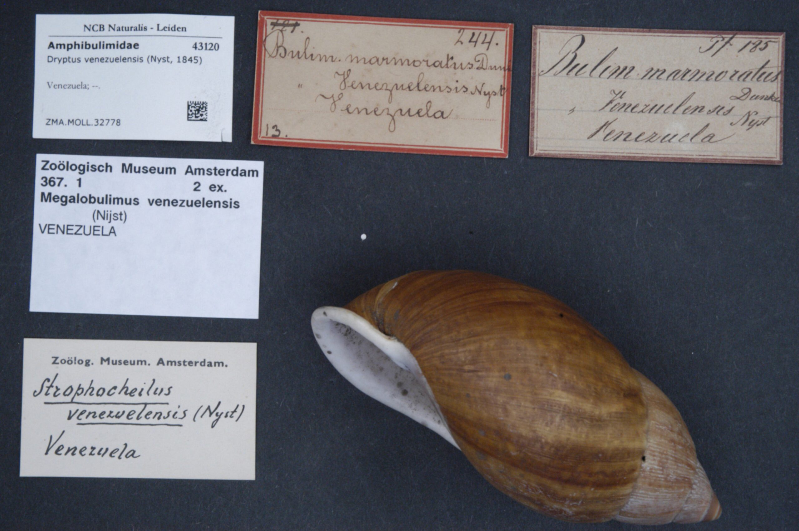 Descrição original: (comoBulimus venezuelensis Nyst, 1845)Nyst, P. H. (1845). Description de deux Bulimes nouveaux de la Colombie. Bulletin de l’Académie Royale des Sciences, des Lettres et des Beaux-Arts de Belgique. 12(3): 227-229., disponível online em https://www.biodiversitylibrary.org/page/38668837
