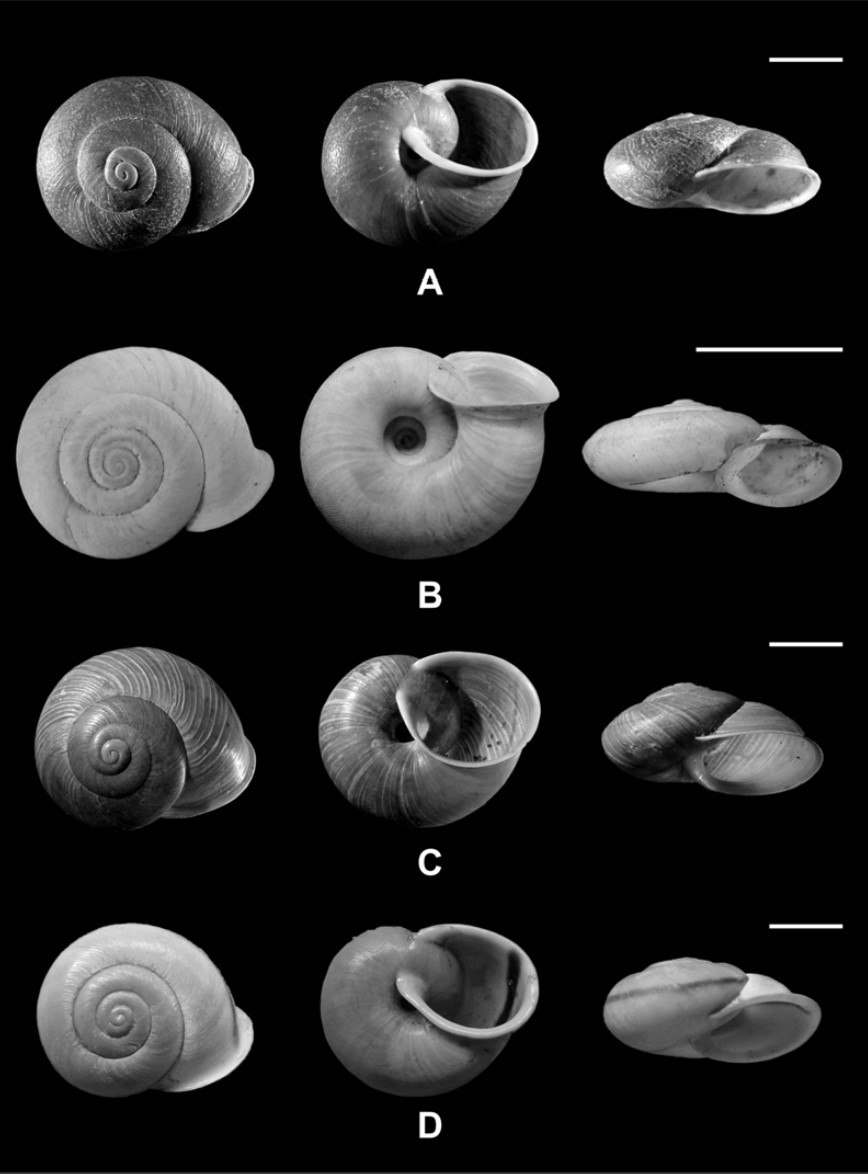 Figura: Cuezzo, 2006: (A) Epiphragmophora proseni (MLP, HOLOTYPE), escala da barra = 10 mm; (B) Epiphragmophora puella (MLP, HOLOTYPE), escala da barra = 20 mm; (C) Epiphragmophora puntana (MACN 1284, LECTOTYPE), escala da barra = 10 mm; (D) Epiphragmophora rhathymos (FML 14520), escala da barra = 10mm