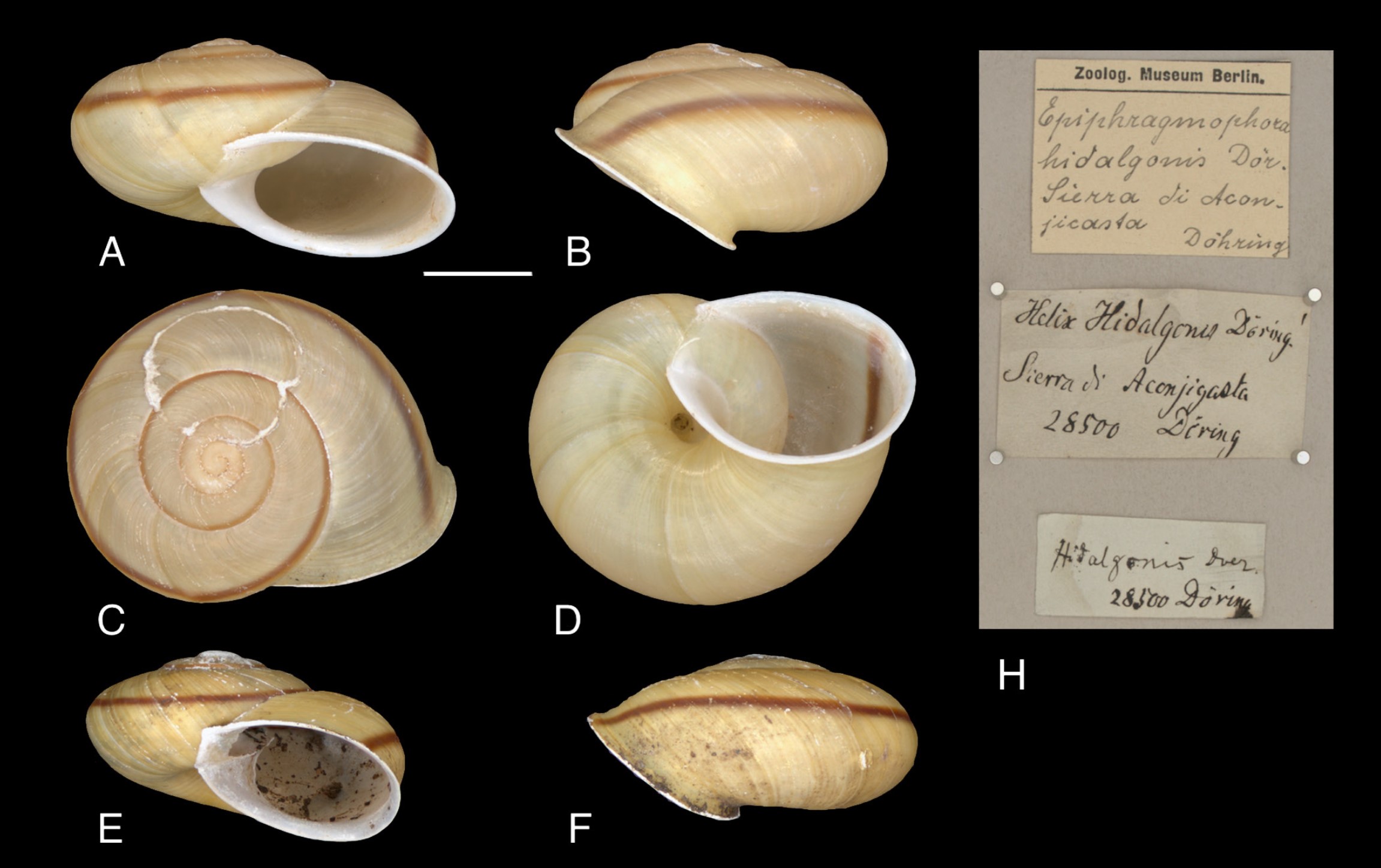 Figura 2: Breure & Ablett, 2024: Museum für Naturkunde Berlin: Epiphragmophora trenquelleonis (L. Pfeiffer, 1850), (A–G) SYNTYPE de Eurycampta hidalgonis Döring, 1877, ZMB/Moll 28500, “la 3a Sierra de Aconjigasta (Pocho)”, 27 mm; (H) etiquetas mostrando a proveniência, escala da barra = 10mm