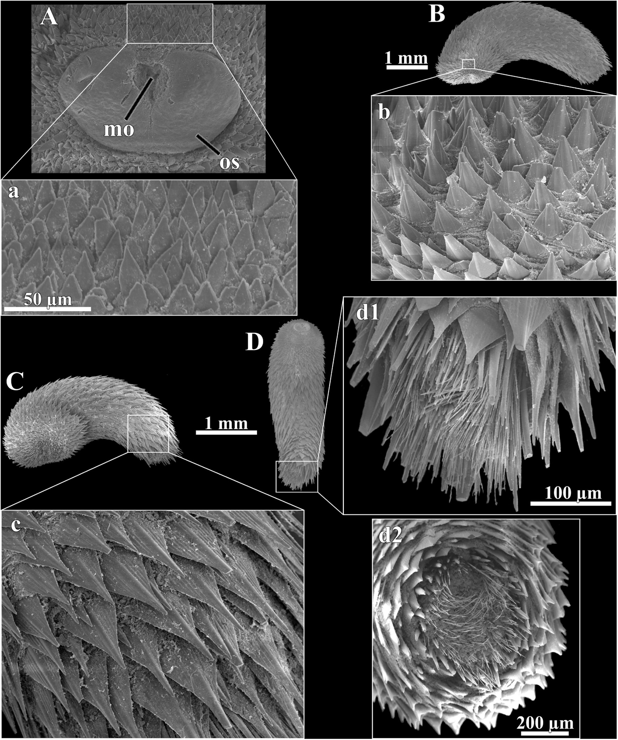 Figura: Passos, F. D.; Fassina, P. V.; Corrêa, P. V. F.; Miranda, M. S. (2022): Falcidens amiae, Fotomicrografias SEM de regiões do corpo e seus escleritos. (A), b, c, d1 estão na mesma escala, assim como (C) e (D). (A) é o indivíduo ZUEC-APL 424, e os escleritos que circundam o escudo oral são mostrados em a. Os escleritos do anterium de B (ZUEC-APL 392) são ampliados em b. C é o ZUEC-APL 391, e os escleritos da parte posterior do tronco (na proximidade do posterium) são mostrados em c. d1 e d2 são, respectivamente, vistas lateral e posterior do posterium de D (ZUEC-APL 408). m – boca, os – escudo oral