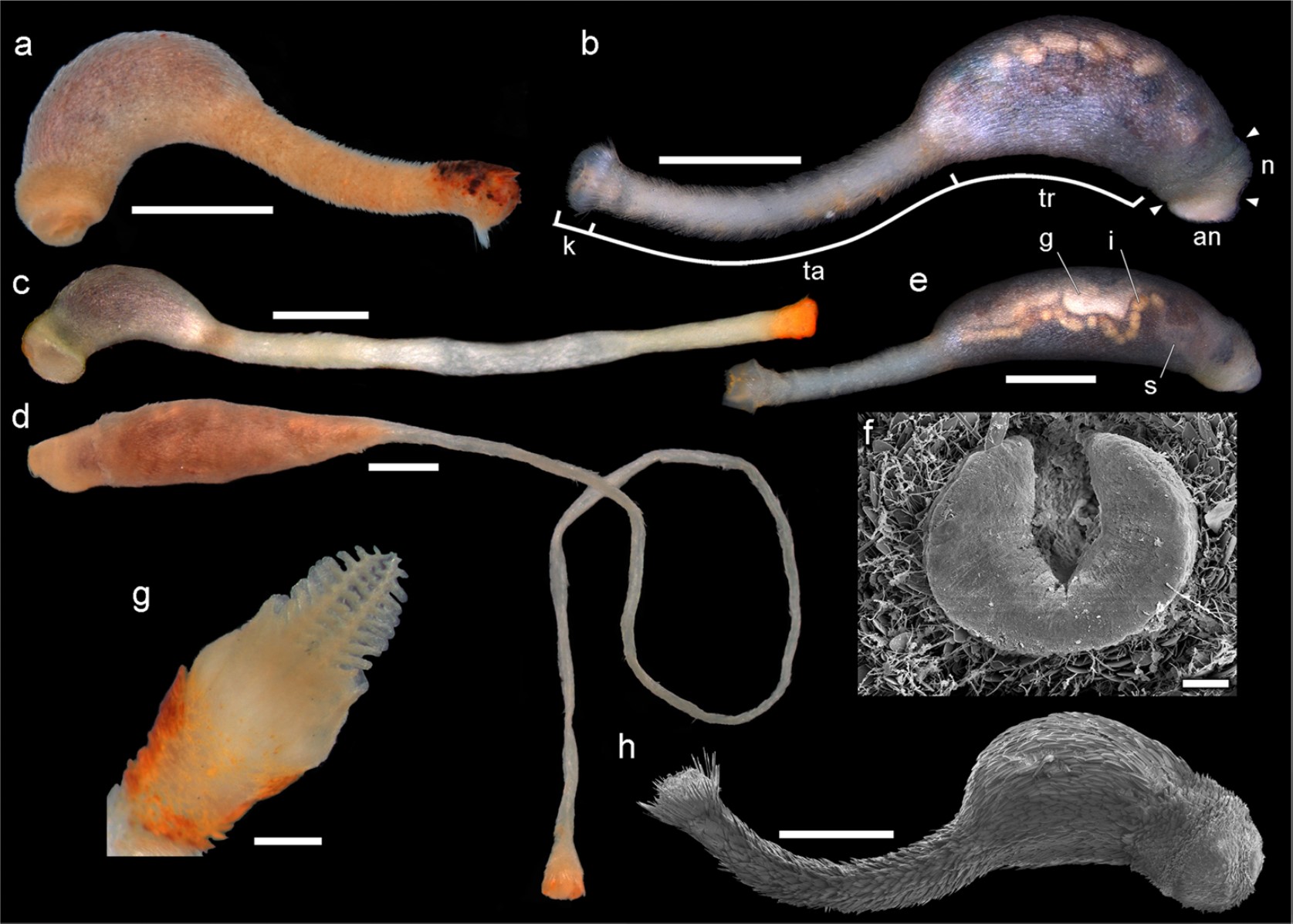 Figura 1: Passos et al. 2016: (a–e e g) Fotomicrografias de espécimes inteiros vistas dos lados direito (b, e) e esquerdo (a, c, d). Micrografias eletrônicas de varredura de um espécime inteiro (h) e detalhe do escudo oral (f). Em a (holótipo ZUEC APL 78), b, e e h, os animais estão contraídos, enquanto em c e d, eles são mostrados totalmente estendidos