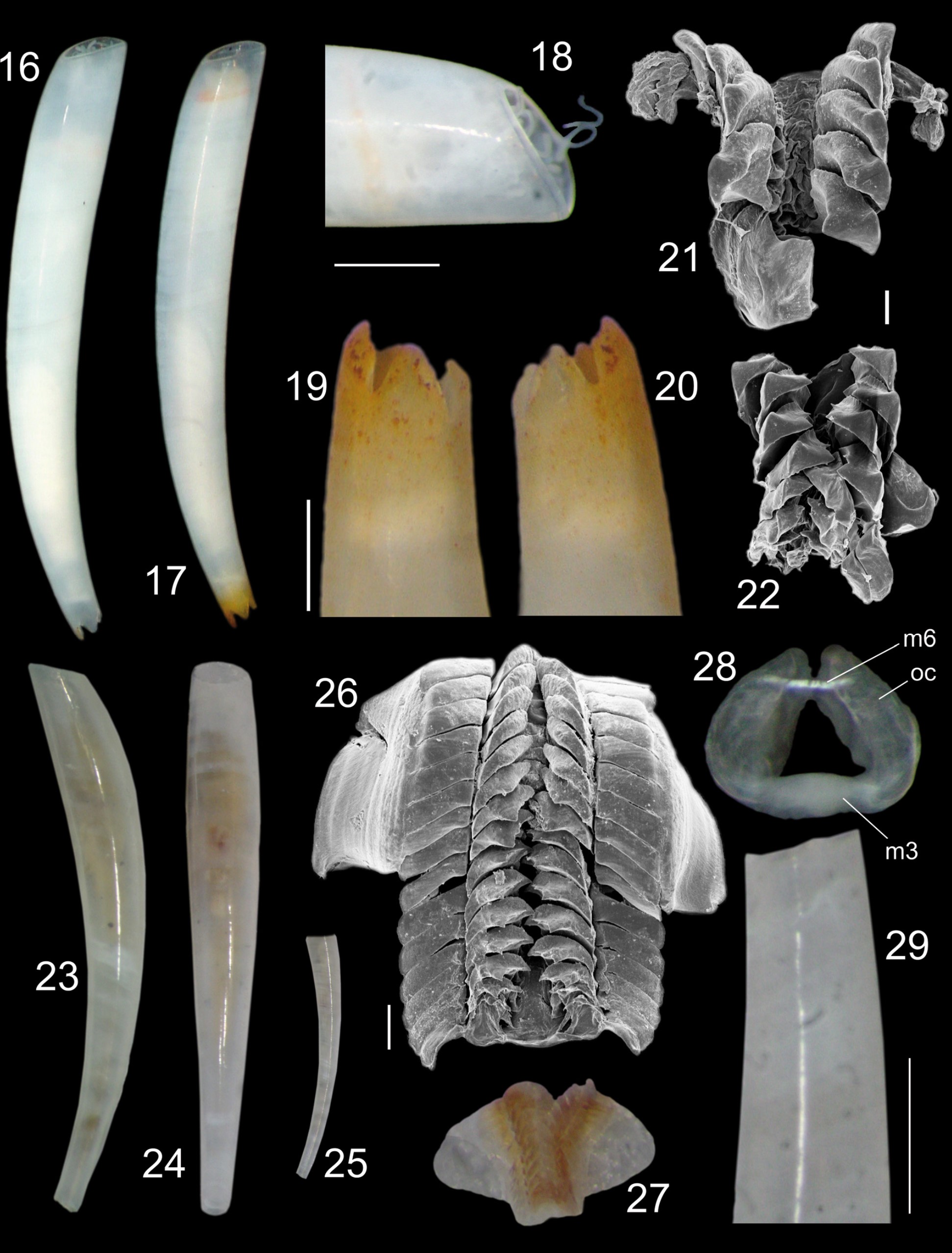 Figura: Simone, 2009: (16‑22) Polyschides noronhensis; (16) HOLOTYPE, 8.6 mm; (19) PARATYPE MZUSP 32011, 7.8 mm; (18) PARATYPE MZUSP 32011#1. (19‑20) PARATYPE MZUSP 46736; (21‑22) Radulae de 02 espécimes no SEM, escala = 50 μm; (23‑29) Gadila braziliensis MZUSP 46736, 7.8mm