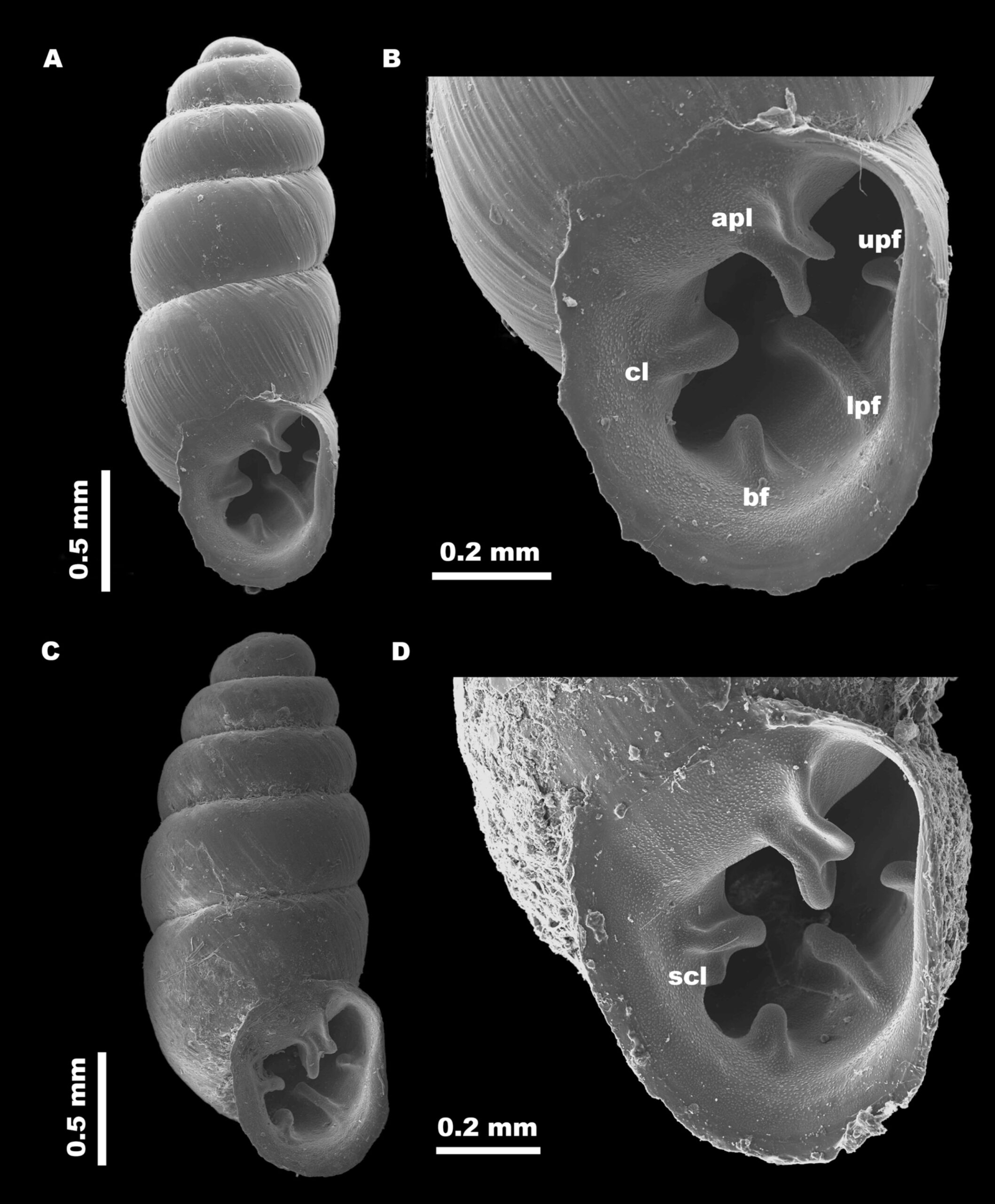 Figura: Brito, Fátima & Miquel, Sergio. (2022): Gastrocopta subandina: (A-B) HOLOTYPE MLP 8902-1, Rumi Huasi, Cabana, Córdoba; (C) PARATYPE MACN-In 9439-2, Lomas del Potrero, Chumbicha, Catamarca; (D) MLP 11834, Aguas de Ramón, Córdoba