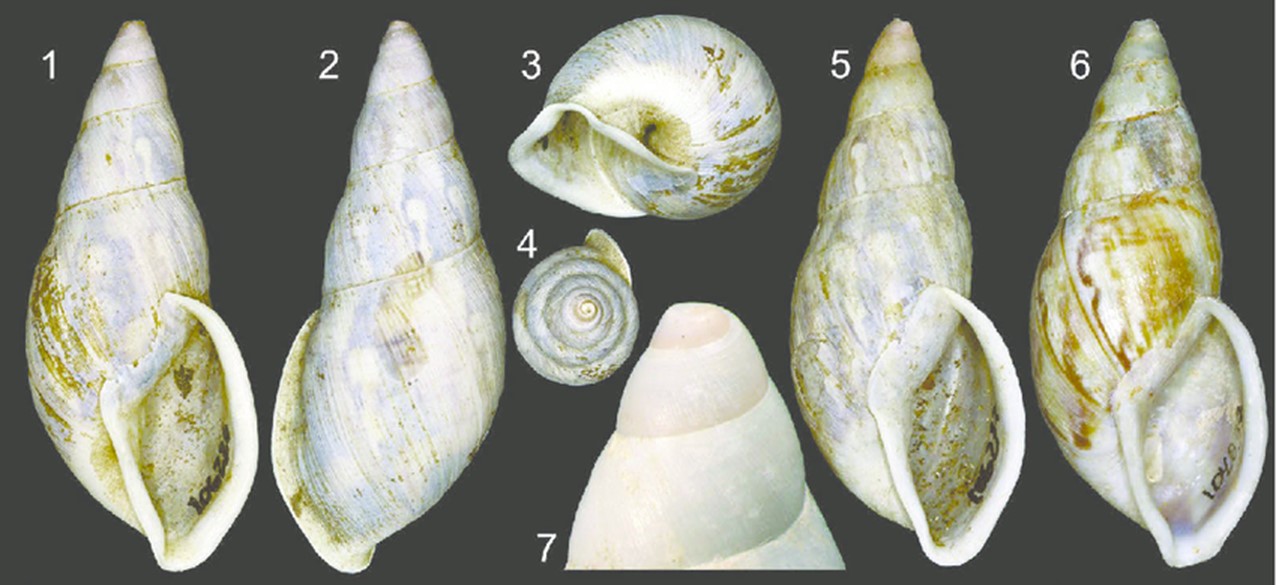 Figura: Simone, 2016. Gonyostomus elinae: (1-4) HOLOTYPE Museu de Zoologia de São Paulo MZSP 106226 (L = 46.9 mm); (5) PARATYPE MZSP 106237 (L= 46.2 mm); (6) PARATYPE MZSP 104837#1 (L=40.9 mm); (7) detalhe do ápex, MZSP 104837#2