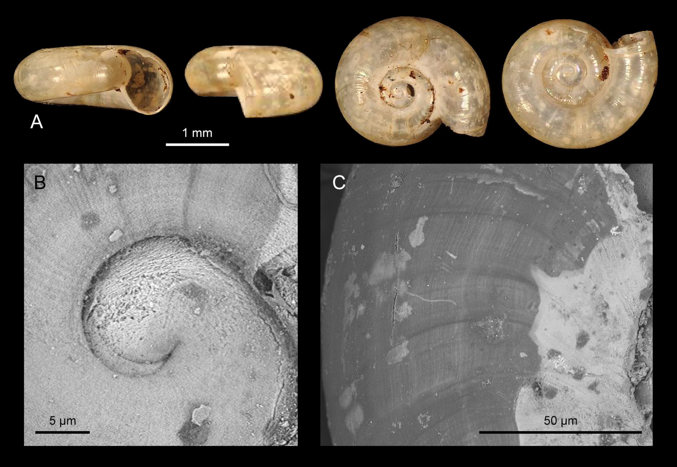Roosen, M. T.; Salvador, R. B.; Breure, A. S. (2025): “Shell minute, transparent-whitish, with a slightly sunken spire. Protoconch 1¼ whorl, without sculpture. Teleoconch sculpture starts with a patch of 16 small, densely crowded axial ribs and numerous indistinct spiral