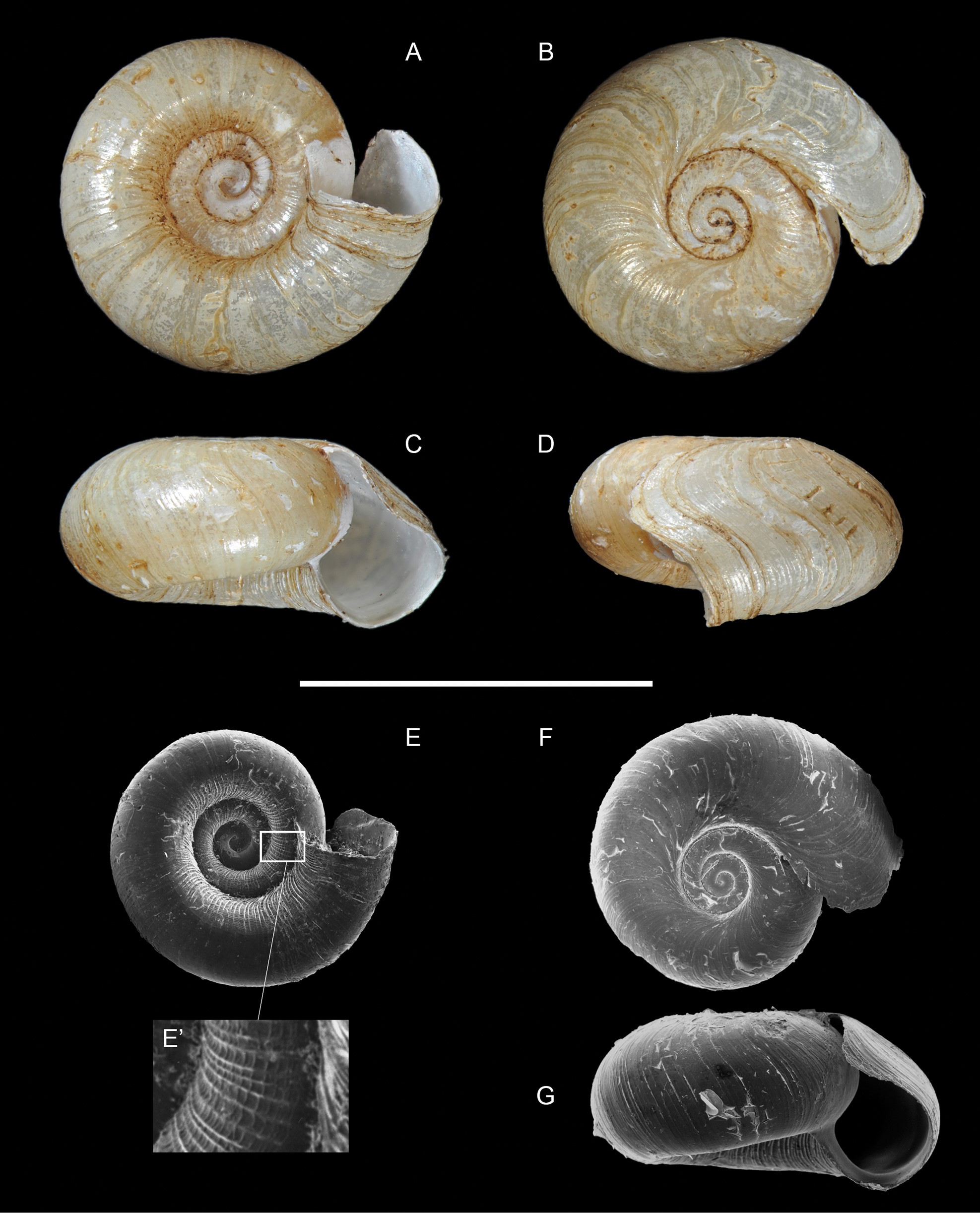 Figura: Gargominy et al. 2025: Happia decaensi: (A–D) HOLOTYPE MNHN-IM-2013-75995; (E) PARATYPE MNHN-IM-2018-14429; (F) PARATYPE MNHN-IM-2018-14430; (G) PARATYPE MNHN-IM-2018-14431. Escala da barra: 5 mm