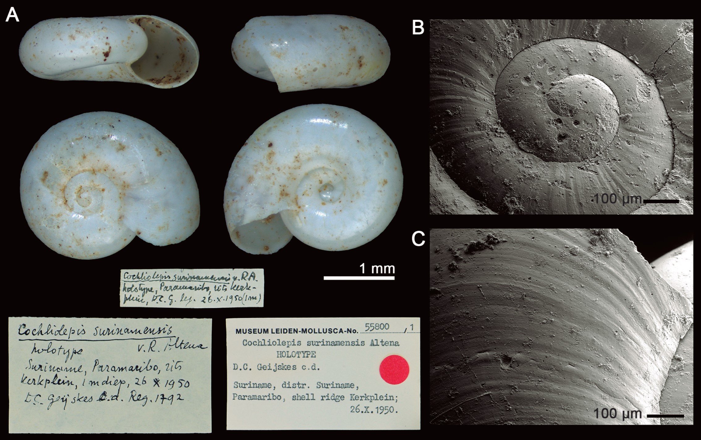 Figura: Salvador et al. 2026: Happia surinamensis (van Regteren Altena, 1966), HOLOTYPE RMNH.MOL.55800: (A) vistas padrão da concha e etiquetas históricas; (B) detalhe das primeiras espiras, observadas em microscopia eletrônica de varredura (SEM); (C) detalhe da última espiral, observada em SEM