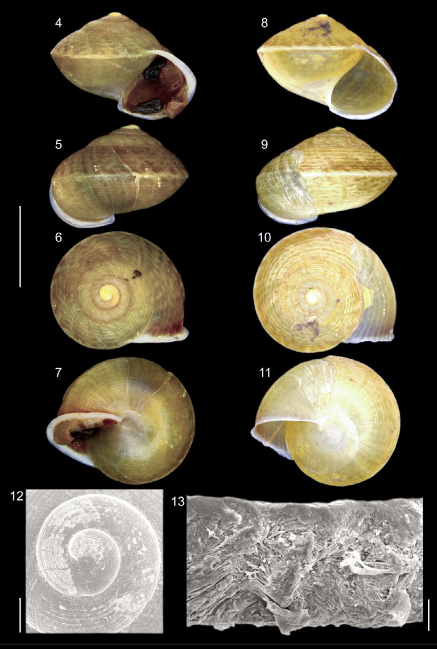 Figura 1: La Pasta, Ariel. (2025): Angulata angulata, (4–7) IBUFRJ22012, Macho; (8–11) IBUFRJ22615, Fêmea; (12) IBUFRJ22615, detalhes da protoconcha; (13) IBUFRJ22615, detalhe da ultraetrutura da concha