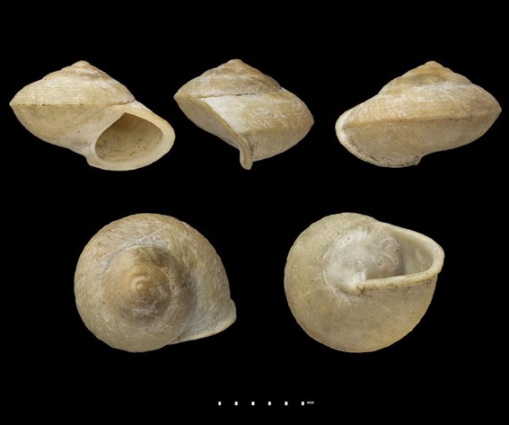 Fotos: (1) cortesia Femorale, 2022, 12.8mm; (2) Natural History Museum, London: SYNTYPE de Helicina carinata, NHMUK 1854.10.4.179, Bolívia