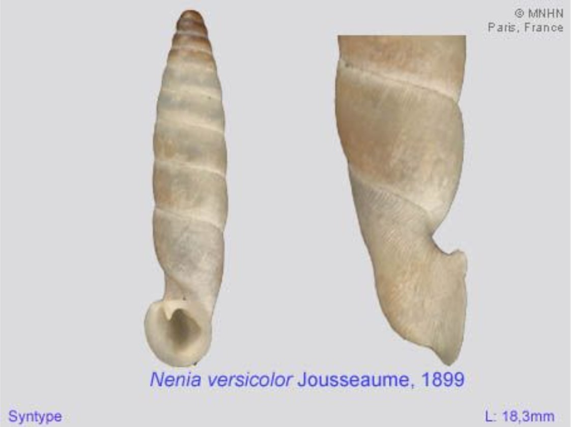 Descrição original: (como Nenia versicolor Jousseaume, 1900) Jousseaume, F. (1900). Mollusques terrestres. Clausilia, Rhodea et Bulimus Sud-Americanae. Bulletin de la Société Philomatique de Paris, ser. 9. 2(1): 5-44., disponível online em https://biodiversitylibrary.org/page/31964296