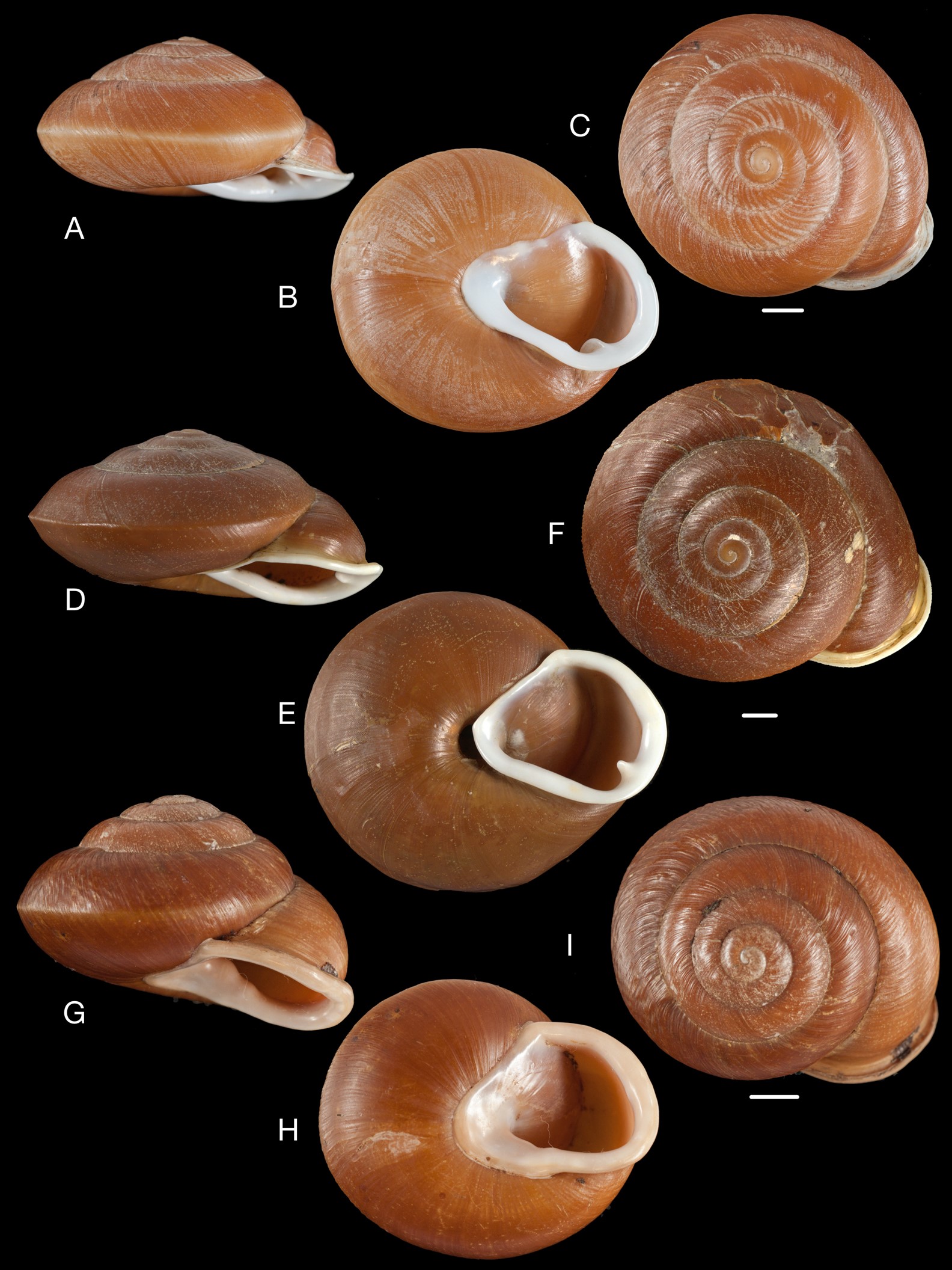 Figura 1: Breure, A. S. H. & Araujo, R. (2017): (A–C) Isomeria globosa (Broderip in Broderip & Sowerby I, 1832), MNCN 15.05/58516; (D-F) Isomeria jacksoni Solem, 1966, MNCN 15.05/58512; (G-I) Isomeria juno (Pfeiffer, 1850), MNCN 15.05/13984; escala da linha = 5 mm