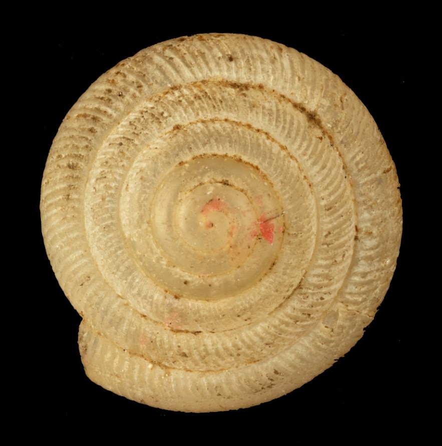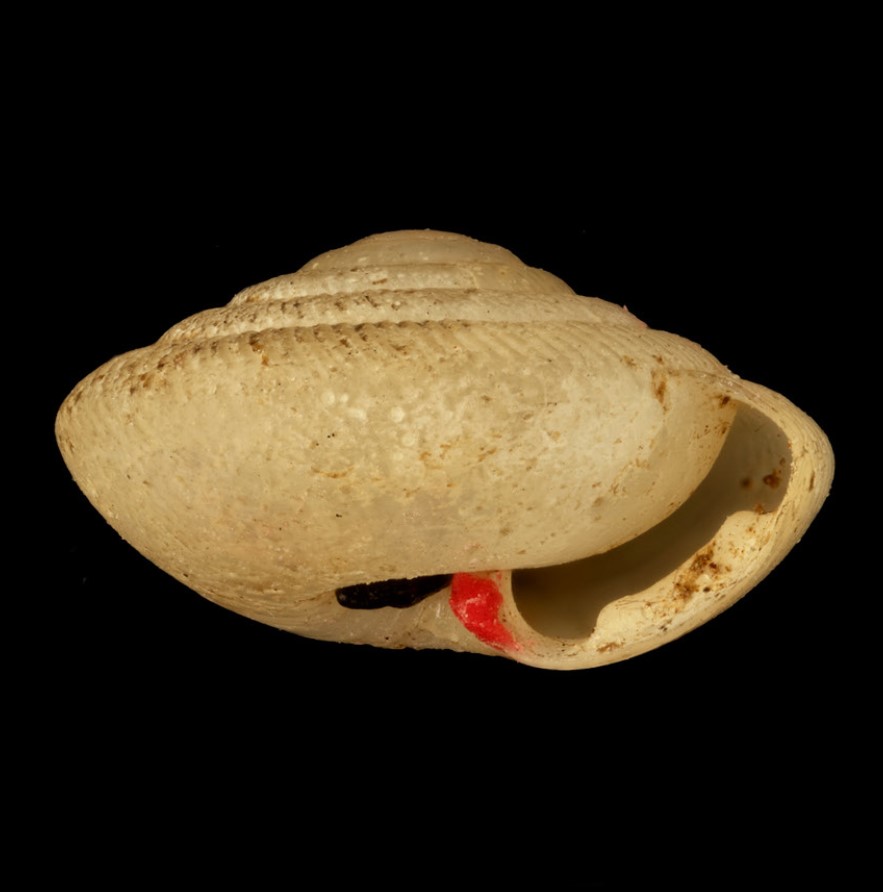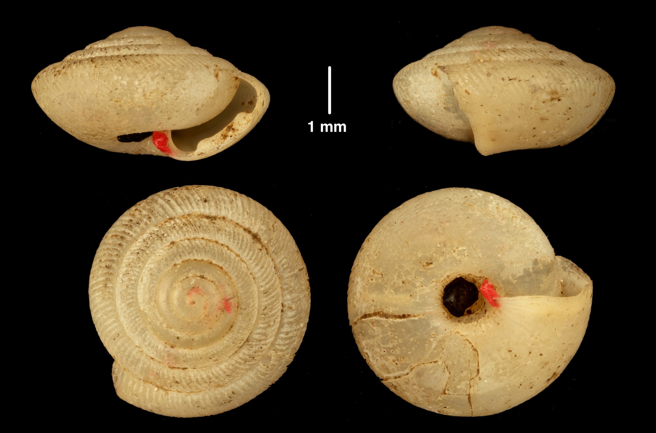 (Roosen, Salvador & Breure, 2025): “Shell small, width c. 5 mm, lenticular, with a step-like spire. Whorls 5, tightly coiled, with an angulation forming a shoulder. Suture well marked. Protoconch 2½ whorls, smooth, with abrupt transition to teleoconch. Teleoconch sculptured by strong, regularly spaced, prosocline ribs that extend from the whorl angulation to the suture; faint ribbing present immediately around umbilicus. Aperture narrow, rectangular, with single basal/palatal barrier.”