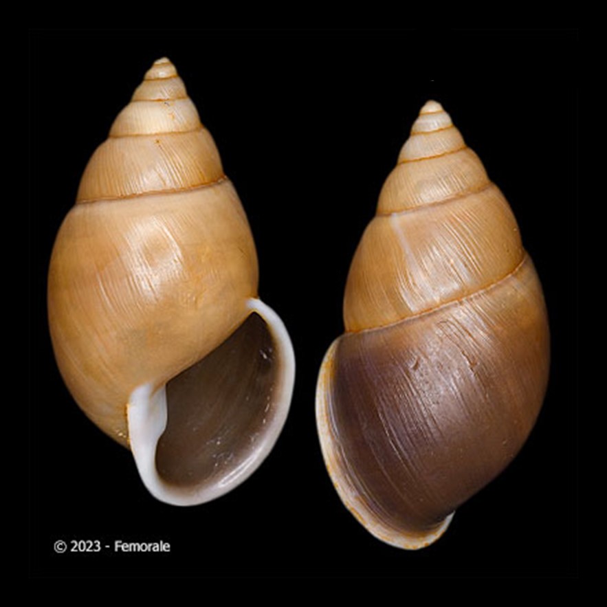 (Simone, 2024) “Size about 30 mm, ~1.9 times longer than wide; lacking dorso-ventral compression. Apex with same color as remaining shell. Subsutural lighter band present. Peristome white. Delicate spiral striae scanty. Aperture occupying ~46% of length and ~65% width. Implantation of outer lip slightly horizontal. Inner lip with high middle fold. Umbilicus narrow”