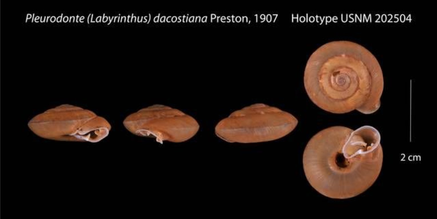 Fotos: (1) Labyrinthus diminutus, cortesia Femorale, 2013. 19,1 mm; (2) The Academy of Natural Sciences, Philadelphia: LECTOTYPE de Pleurodonte dacostiana, ANSP 45551, Chanchamayo, Peru, col. Sowerby & Fulton, ii.1920; (3) National Museum of Natural History, Smithsonian Institution: HOLOTYPE de Pleurodonte (Labyrinthus) dacostiana, USNM 202504, Peru, Chanchamayo, coll. H. Preston
