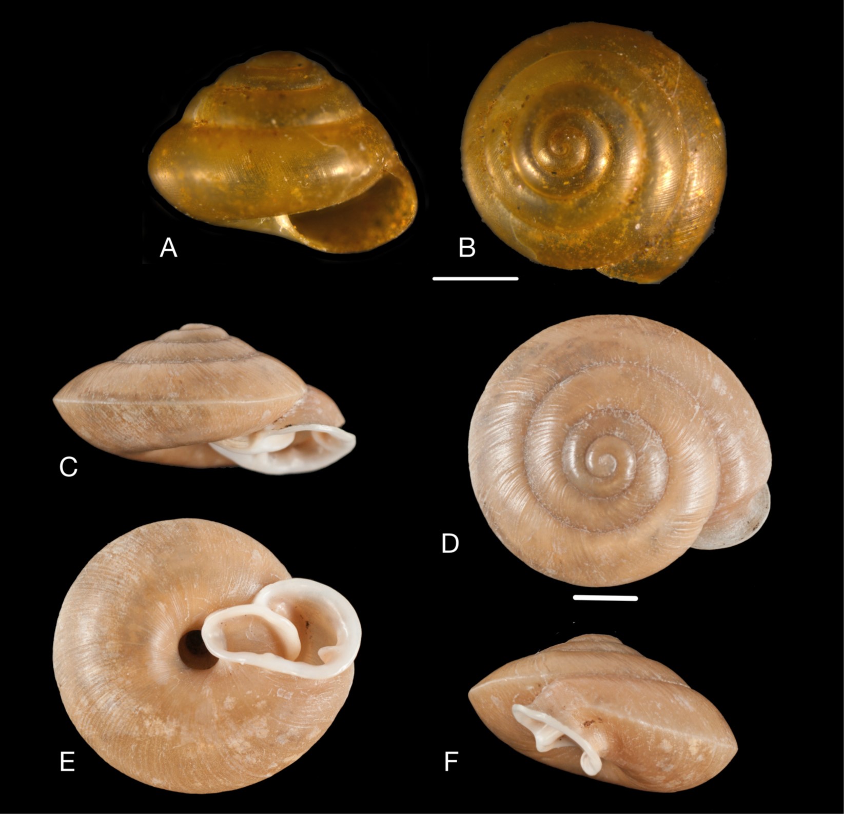 Figura: Breure, A. S. H. & Araujo, R. (2017): (A–B) Euconulus martinezi (Hidalgo, 1869), MNCN 15.05/3190; (C–F) Labyrinthus manueli Higgins, 1872, MNCN 15.05/13803, Equador, coll. Paz
