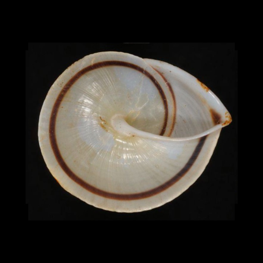 (Pilsbry, 1930): “The shell is imperforate, trochiform, acutely carinate; thin; grayish white under a very thin, faintly yellow periostracum, with a narrow brown band near the middle of the wliurls of the spire, failing on the last whorl, and a brown line immetliately below the suture, widening into a comma-shaped spot at tlie apex: on the base there is a wider carob brown band a short distance below the peripheral keel; there is a small dark spot above the keel behind the expansion of the lip.