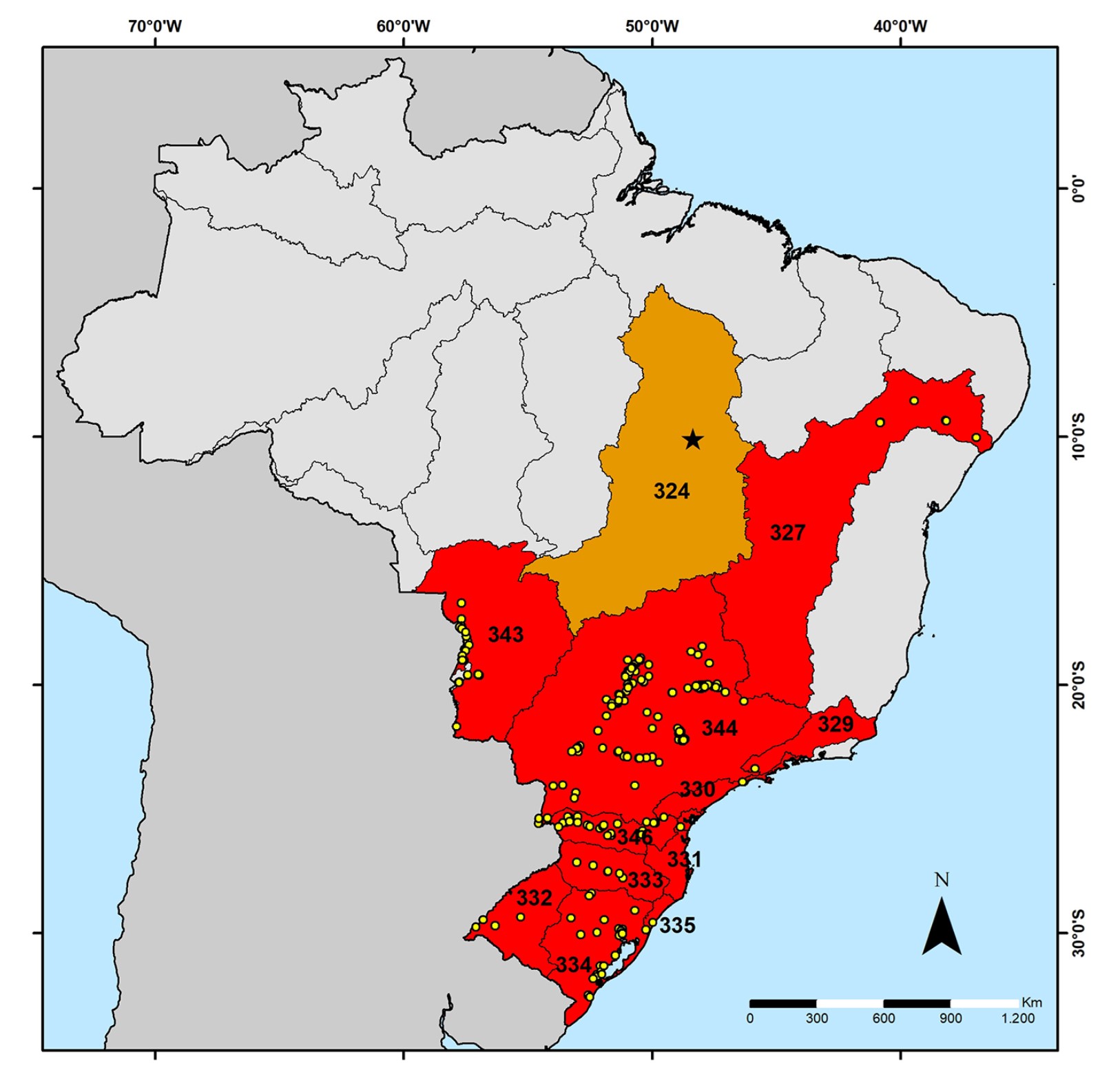 Os códigos das ecorregiões de água doce, seguindo Abell et al. (2008), são 324 (Tocantins-Araguaia), 327 (São Francisco), 329 (Paraíba do Sul), 330 (Ribeira de Iguape), 331 (Mata Atlântica do Sudeste), 332 (Baixo Uruguai), 333 (Alto Uruguai), 334 (Laguna dos Patos), 335 (Tramandaí-Mampituba), 343 (Paraguai), 344 (Alto Paraná) e 346 (Iguaçu). Baseado em Oliveira et al. (2015), Barbosa e cols. al. (2016), Senske et al. (2019), Santos et al. (2022), Miyahira et al. (2024) e CBEIH banco de dados (https://base.cbeih.org/)