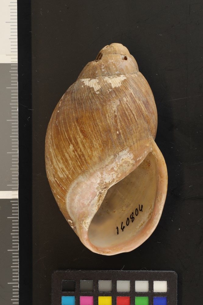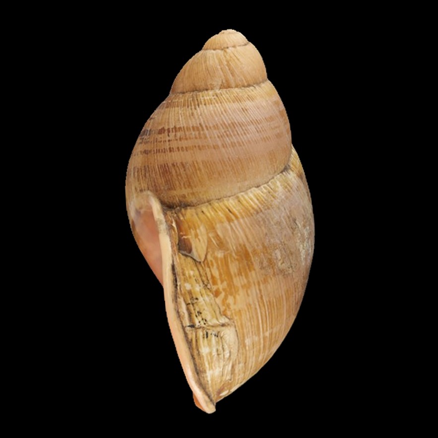 Figura 1: Beltramino, 2016: Colección Malacológica del Museo de La Plata, concha adulta de Megalobulimus abbreviatus, MLP-Ma 14129/2