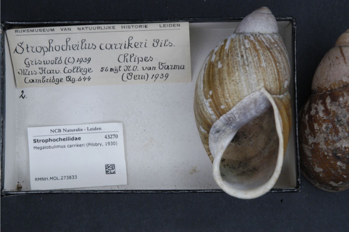 Fotos: (1-3) The Academy of Natural Sciences, Philadelphia; HOLOTYPE de Megalobulimus carrikeri (Pilsbry, 1930), ANSP 151811, Huacapistana, Junin, coll. Carriker, M. A., Jr.: Peru Expedition; (4) Rijksmuseum van Natuurlijke Historie, Leinde: RMNH.MOLL.273833, “56 miles NO from Tarma, Peru, 1939”