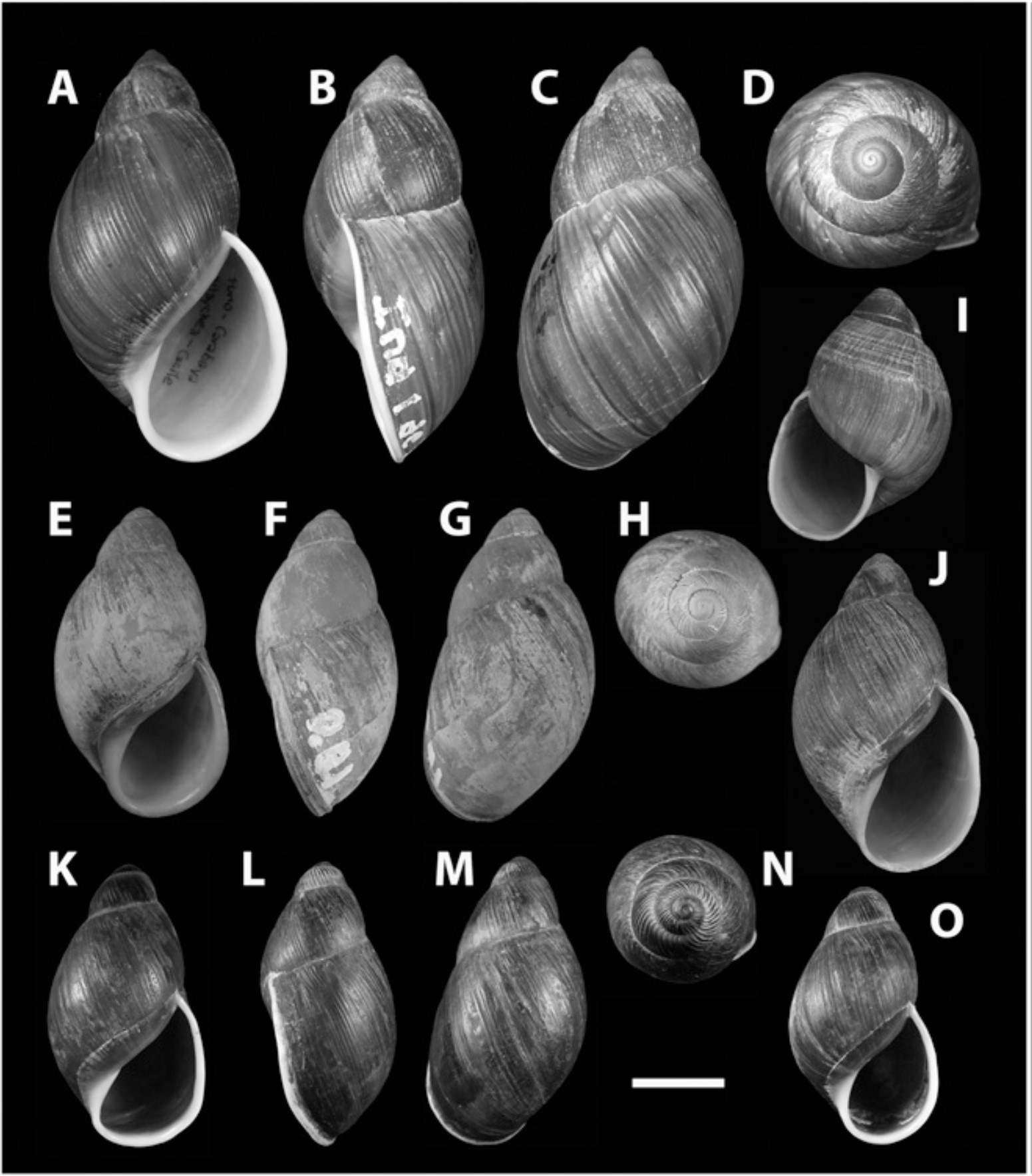 Figura: Borda & Ramírez, 2016: Museo de Historia Natural (MUSM) de la Universidad Nacional Mayor de San Marcos, Peru: (A–D) Megalobulimus inambarisense, HOLOTYPE MUSM 5602; (E–H) Megalobulimus leucostoma proveniente de Pavayoc (MUSM 5604); (I) espécie sinistra (Levogyre) de Megalobulimus leucostoma (MUSM 5613); (J) Megalobulimus leucostoma, proveniente de Sambaray (MUSM 5608); (K–N) Megalobulimus tayacajus, HOLOTYPE (MUSM 5616); (O) Megalobulimus tayacajus, proveniente de Pichiu (MUSM 5618); escala da barra: 20mm